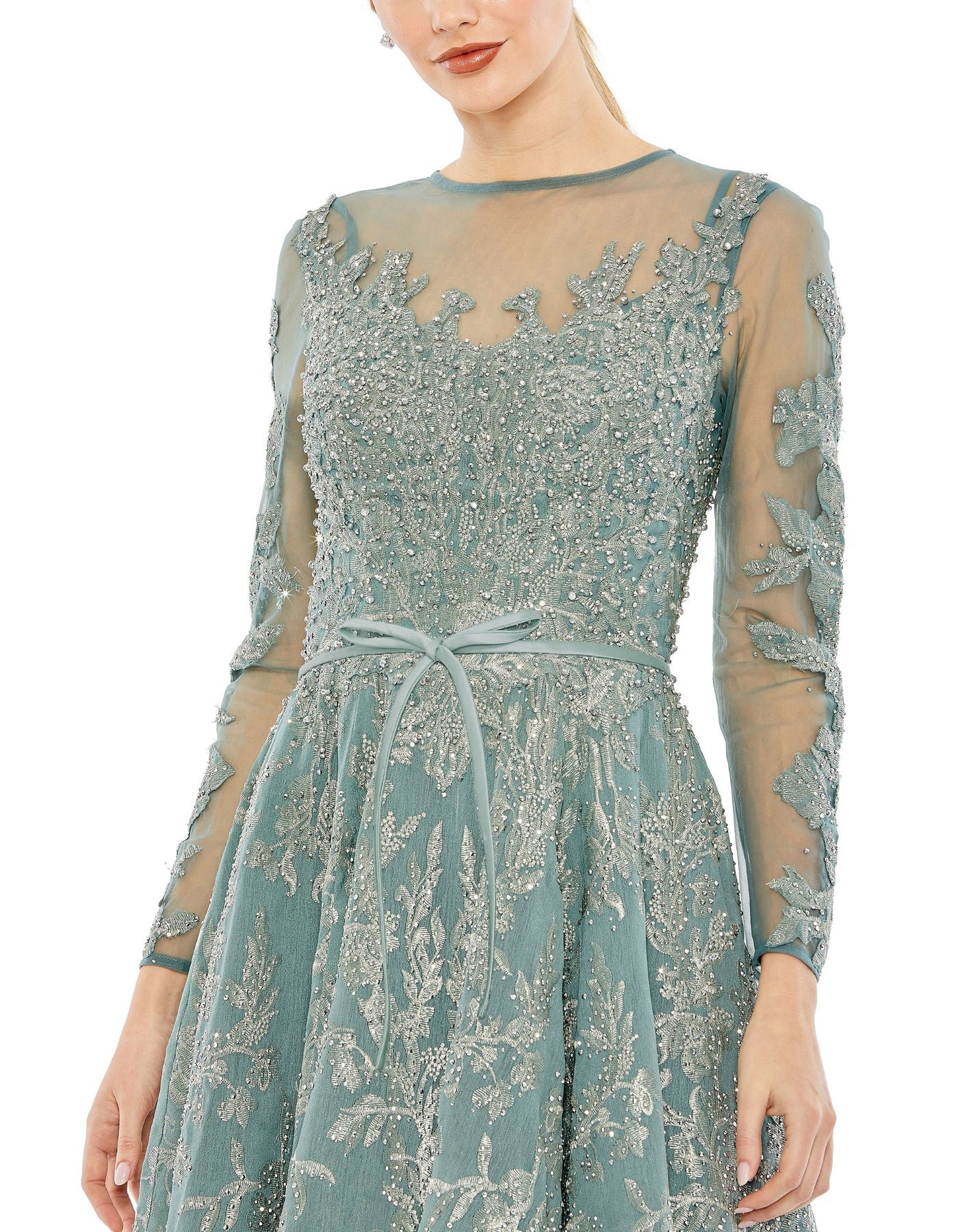 EMBELLISHED BOW BELT ILLUSION LONG SLEEVE A LINE DRESS