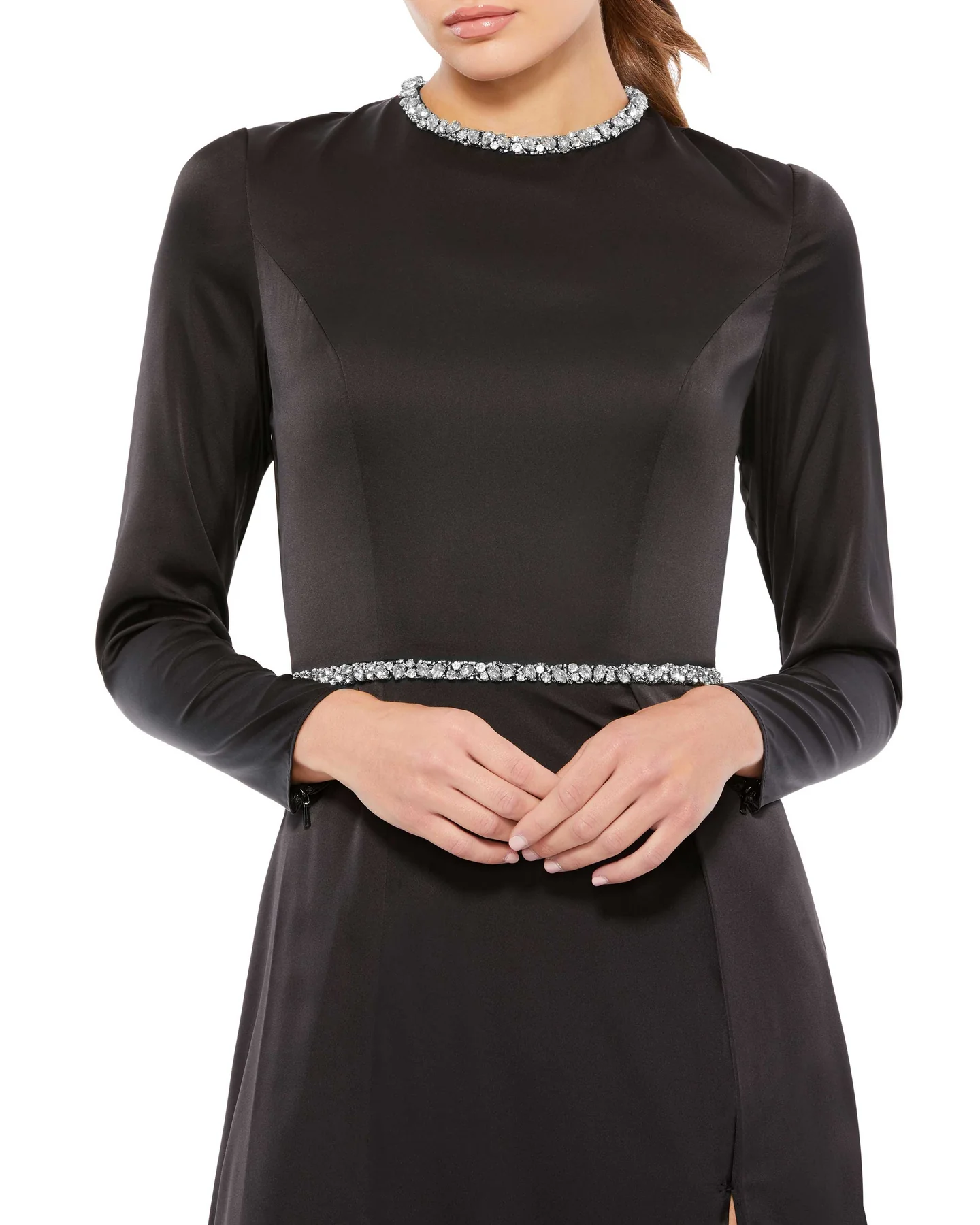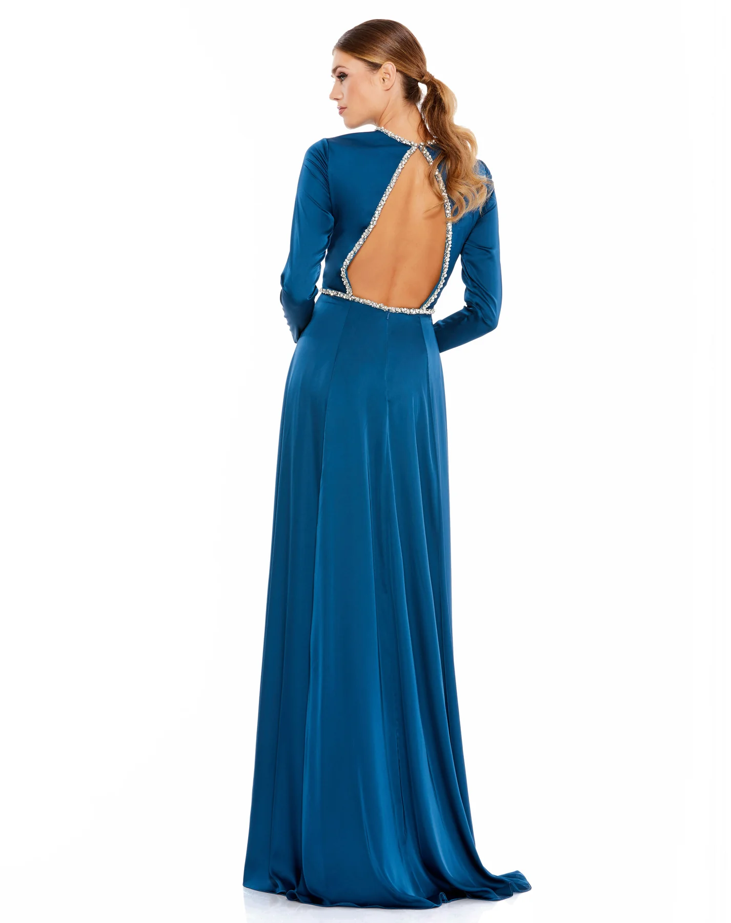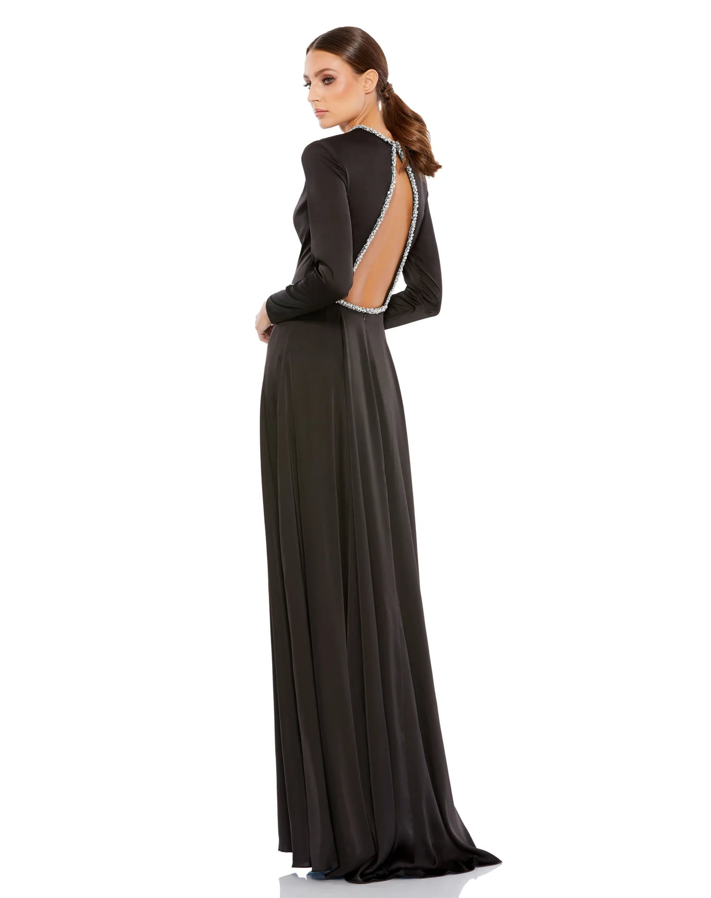 LONG SLEEVE JEWEL TRIMMED CHARMEUSE GOWN