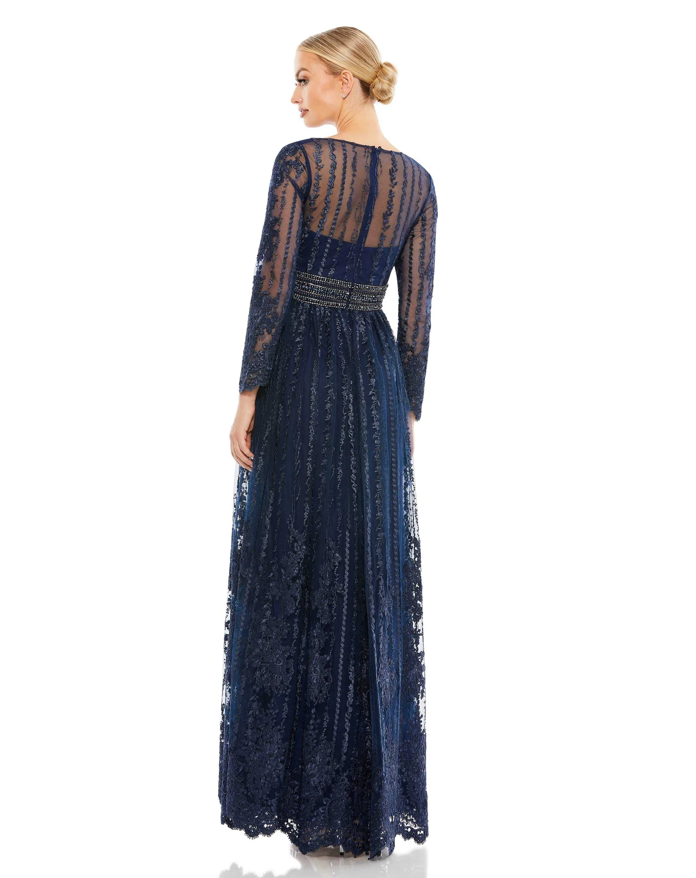 Elegant evening gown features a plunging illusion neckline, sheer sleeves, allover floral embroidery, and a hand-embellished belt.