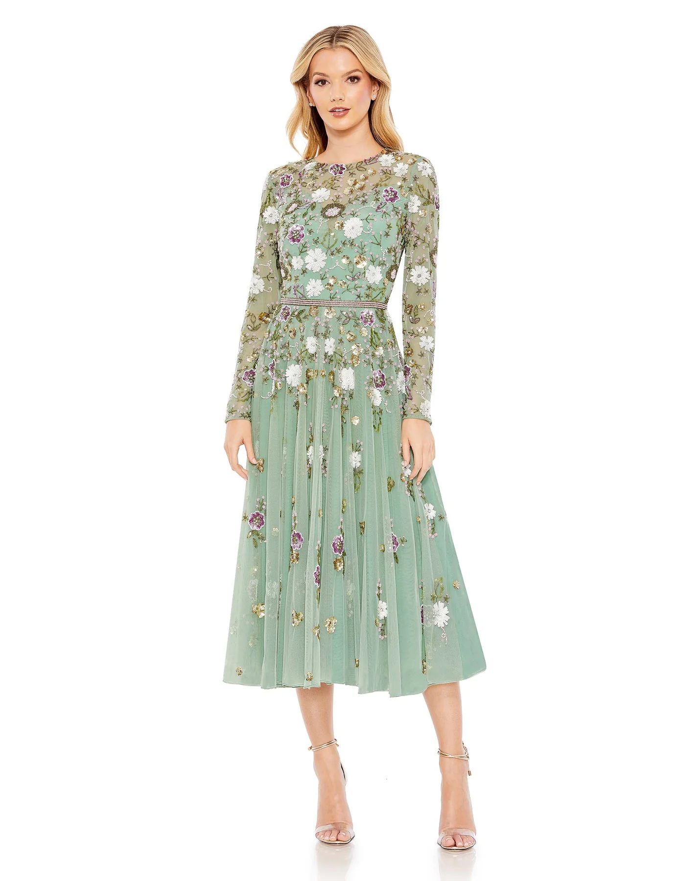 SEQUINED FLORAL LONG SLEEVE HIGH NECK MIDI DRESS