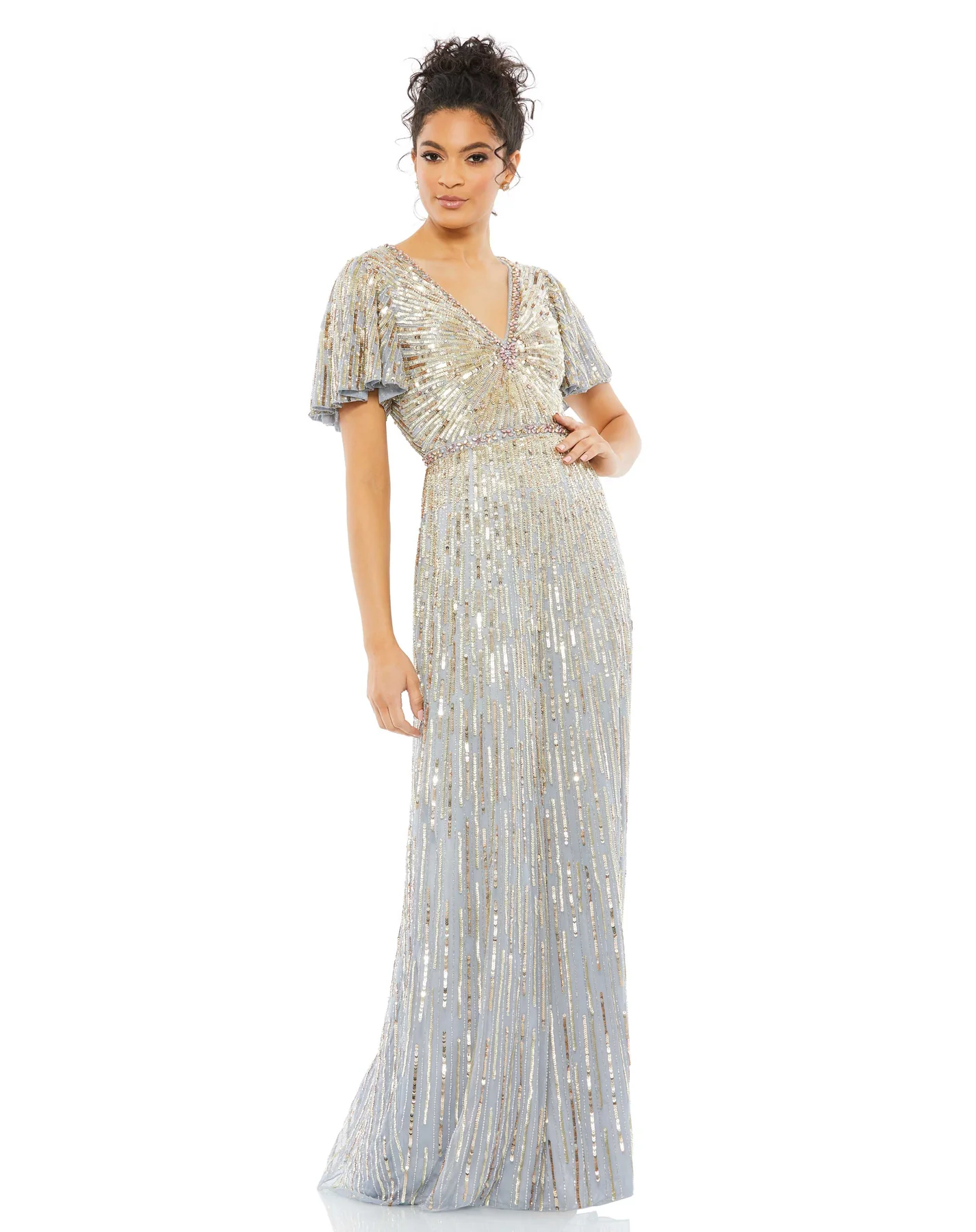 Adorned with shimmering sequins, this embellished v neck butterfly sleeve column gown exudes timeless glamor and sophistication. Featuring a flattering v-neckline and elegant butterfly sleeves, it's the perfect gown for any black-tie affair.