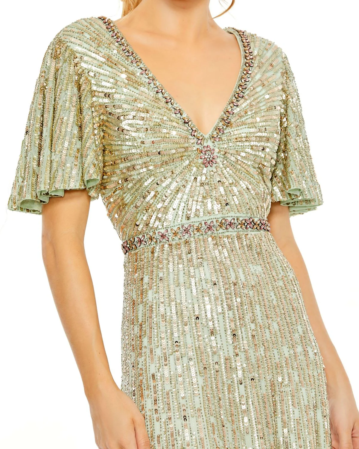 EMBELLISHED V NECK BUTTERFLY SLEEVE COLUMN GOWN