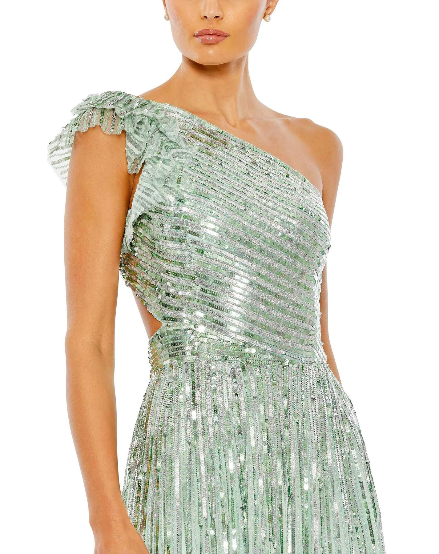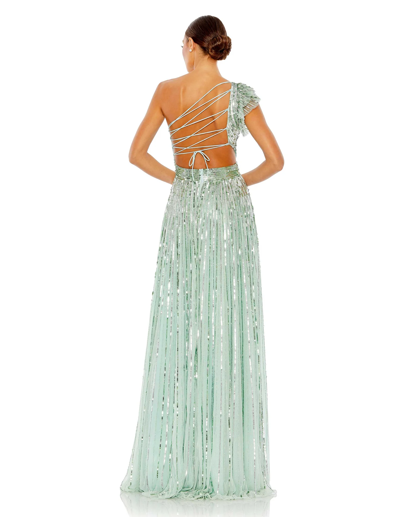 SEQUINED ONE SHOULDER FLUTTER SLEEVE A LINE GOWN