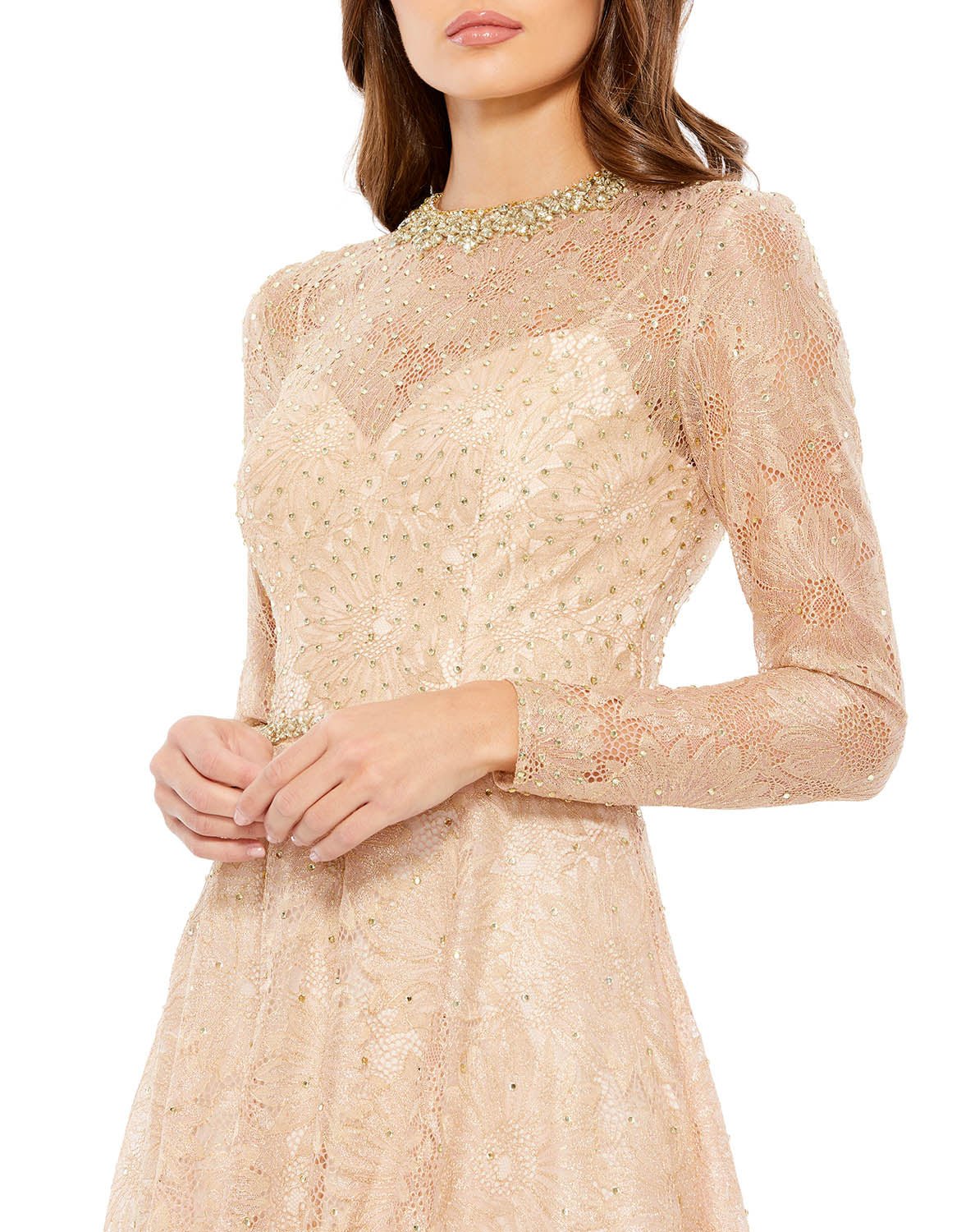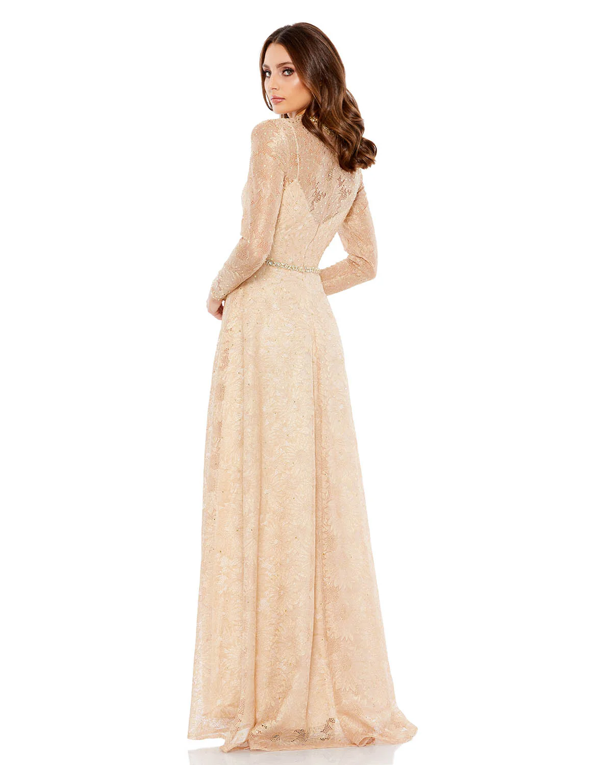 Elegant long-sleeved lace evening gown with an illusion neckline and sleeves, bejeweled neckline, and a flowing a-line skirt. The natural waist is accented by a stunning jeweled belt. Sleeves feature hidden zippers for easy dressing.