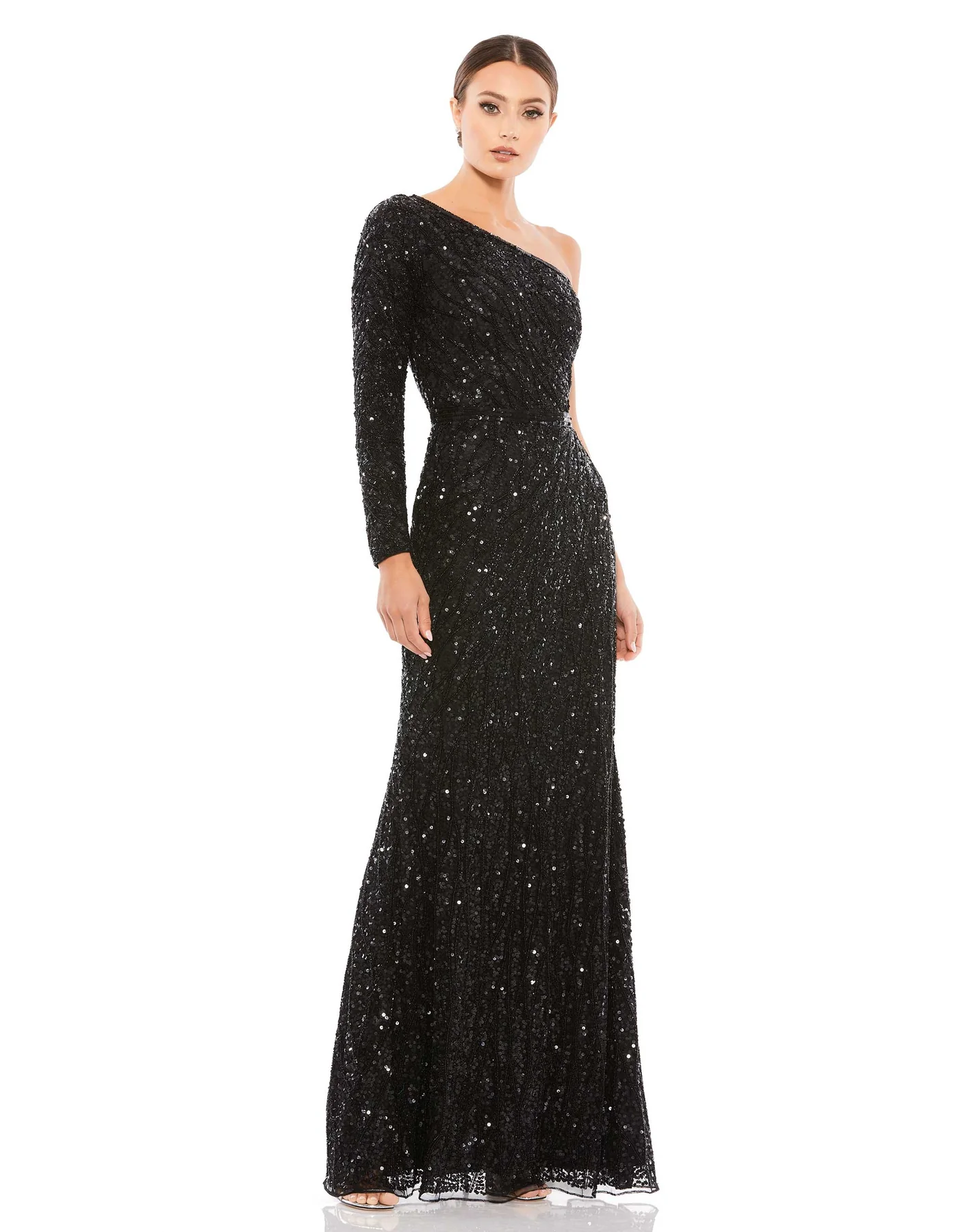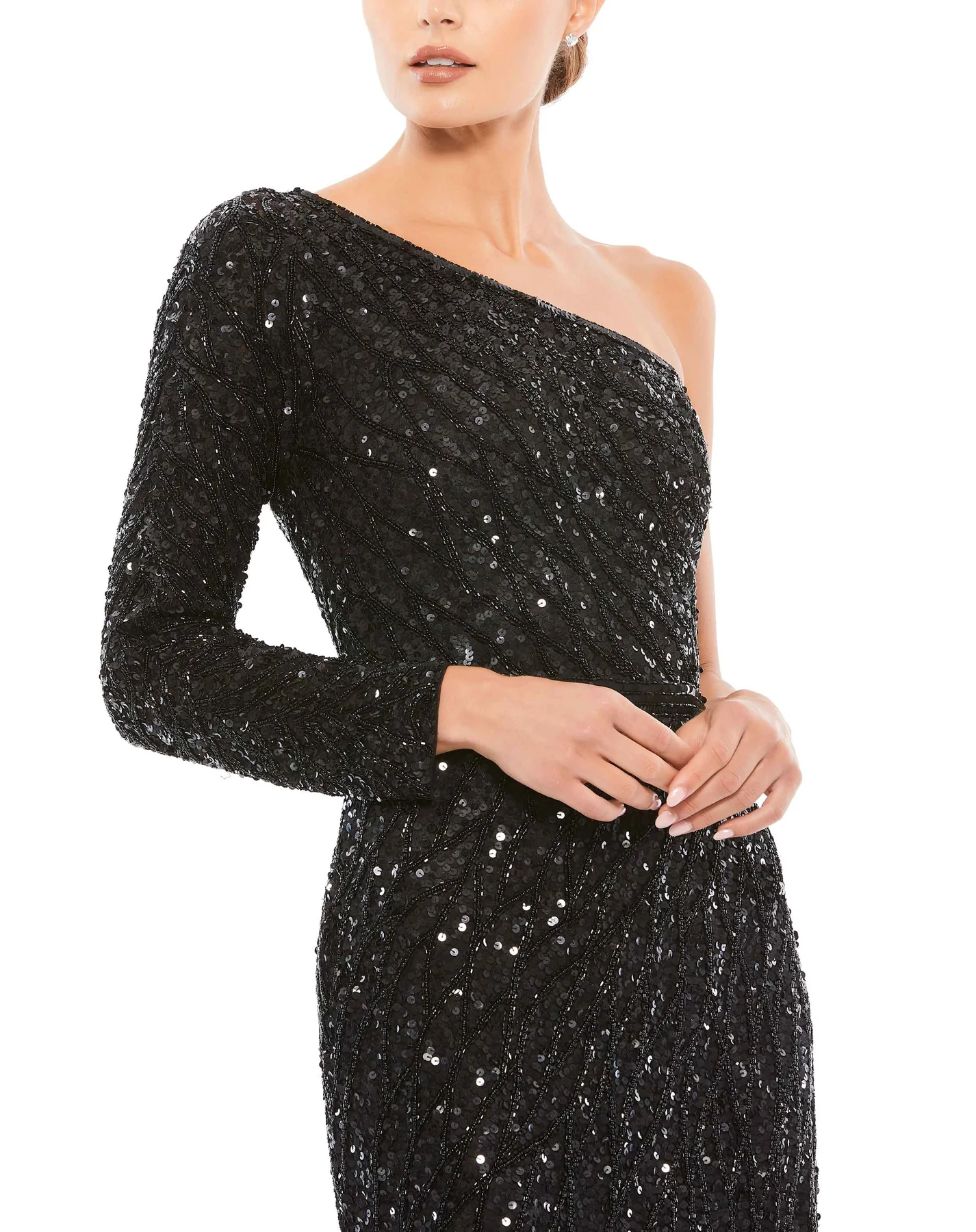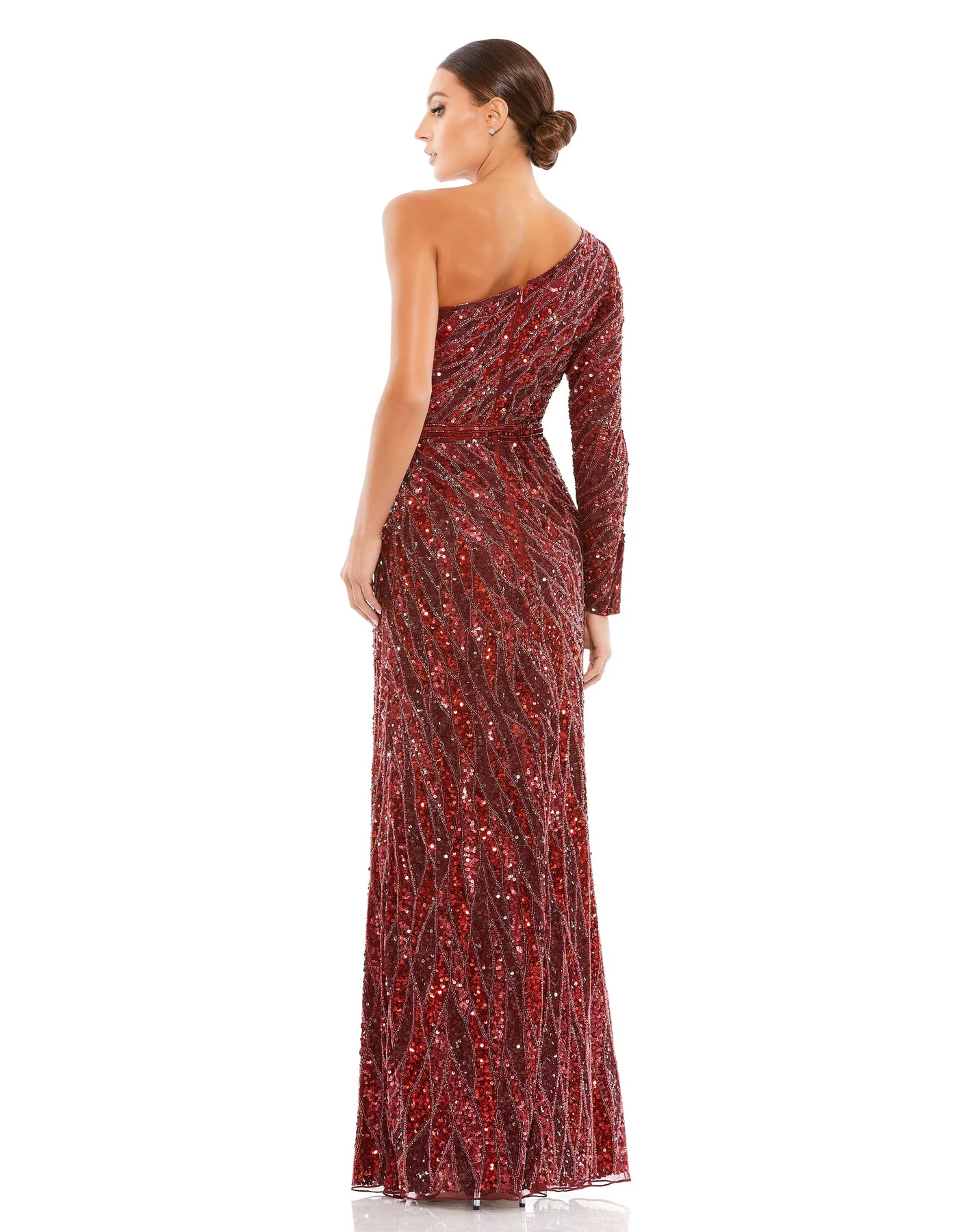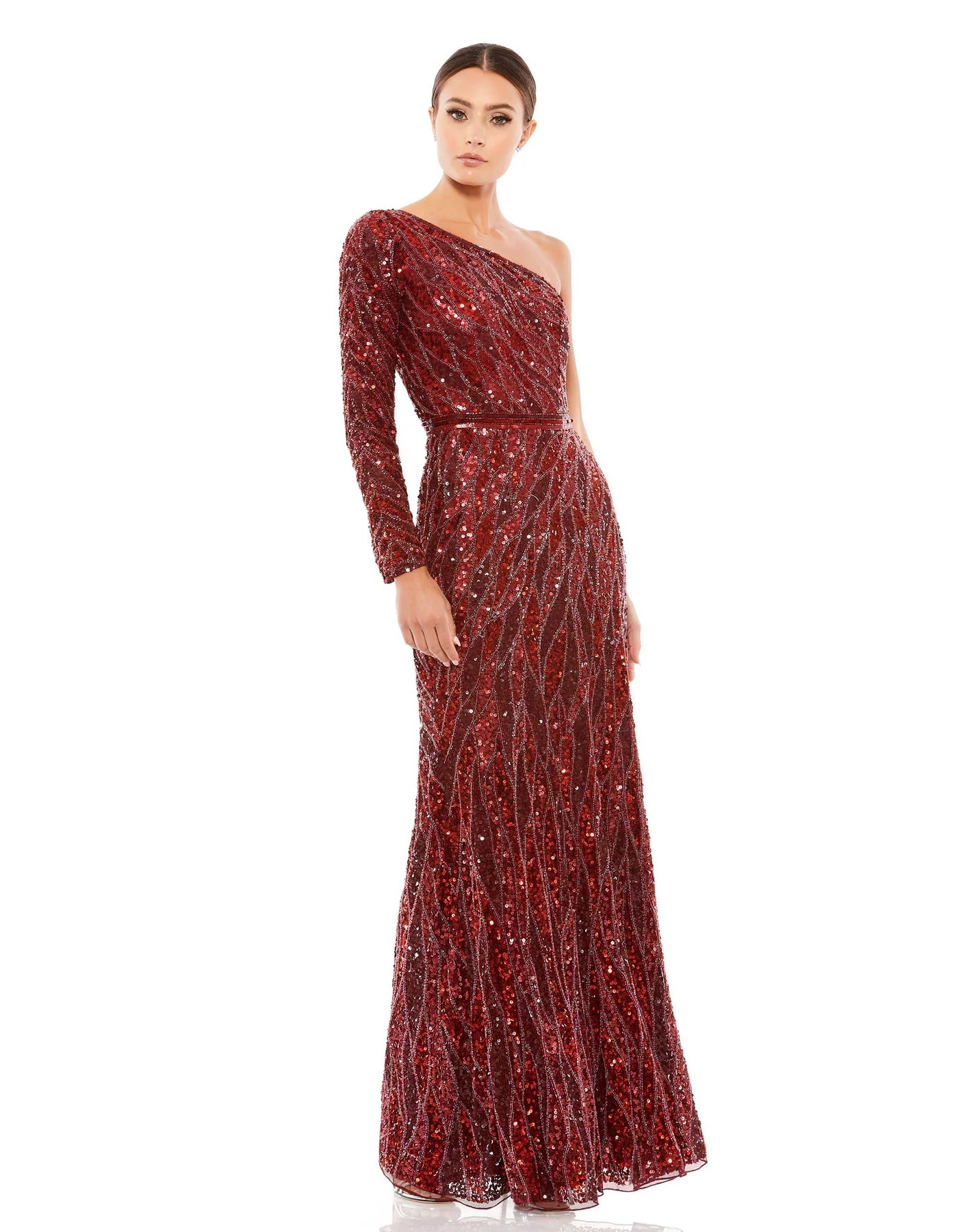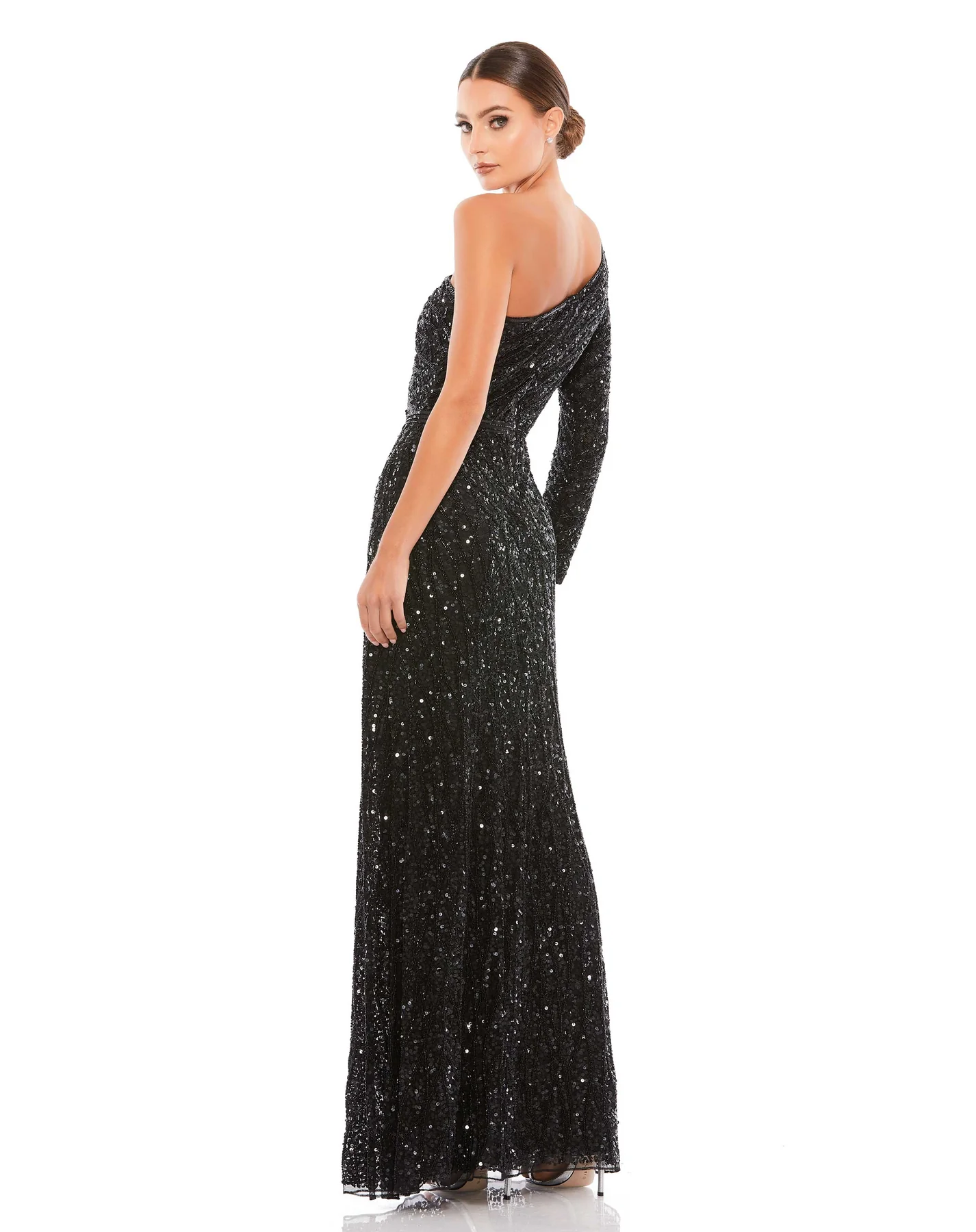 One-shoulder fully embellished evening gown with a single long sleeve, fitted bodice, and a full-length mermaid skirt. The mesh overlay is embellished with ornately-patterned sequins and beads, and a sequin-and-bead belt accents the natural waist.