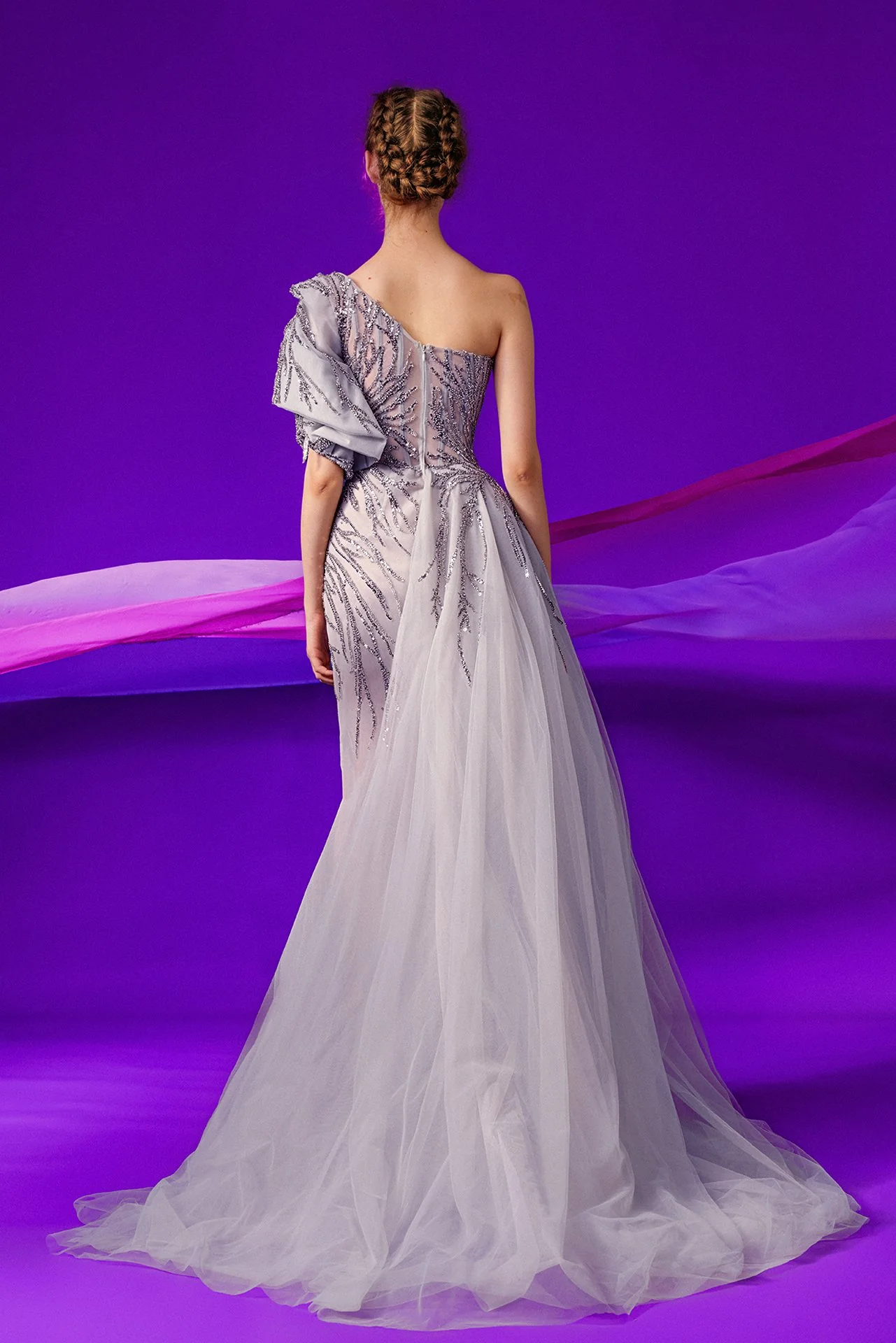 Majestic one shoulder silver tulle evening dress embroidered with argent sequins in a seamless flamboyant pattern on the corset and extended from the shoulder to the draped waist. The ruffled sleeve gives the dress an extraordinary glance especially with the asymmetric high slit tulle over the skirt, and that flows to the floor with a sweep train length. This dress is all you need for your weddings and ceremonies.