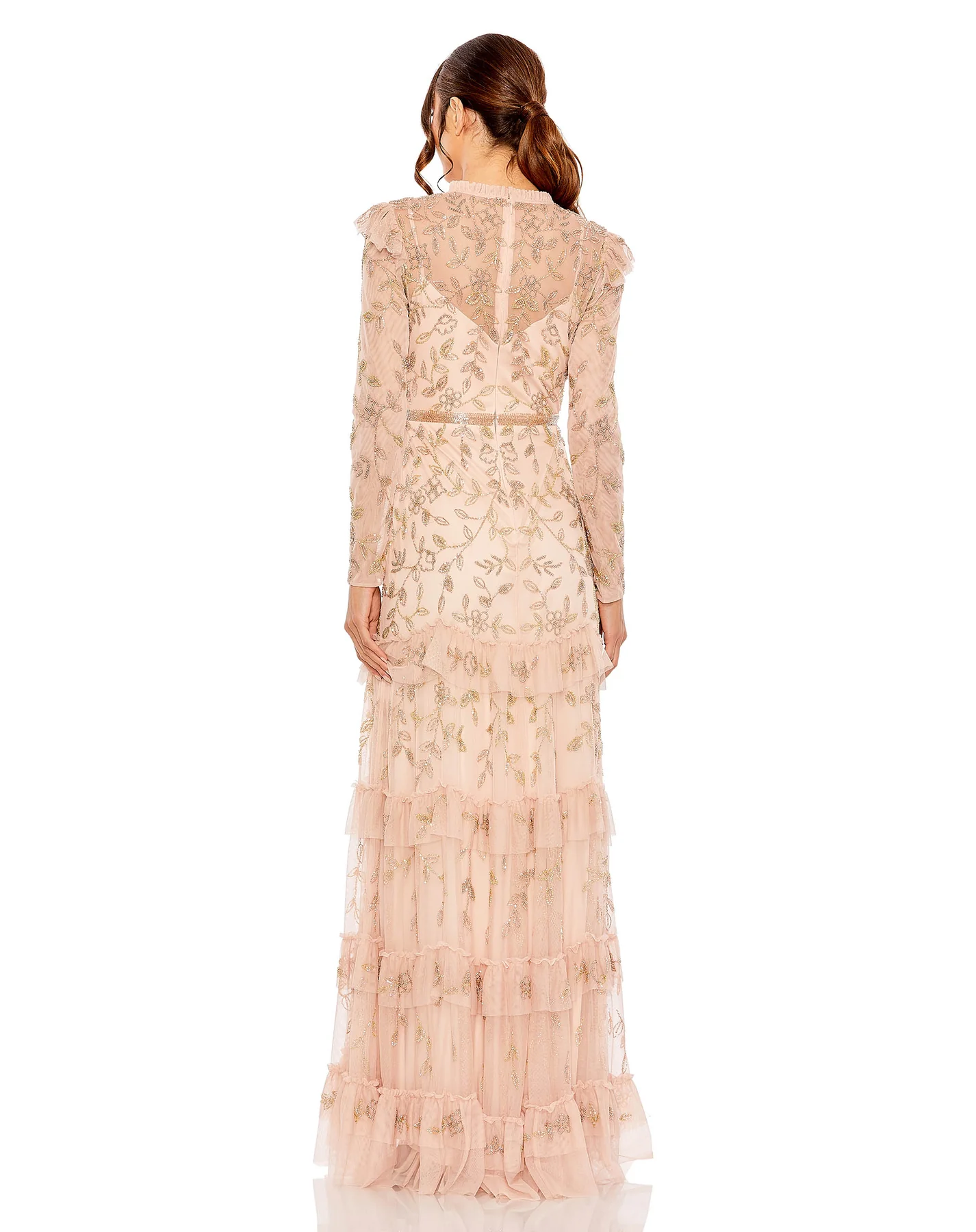 HIGH NECK FLUTTER CAP LONG SLEEVE TIERED EMBELLISHED GOWN