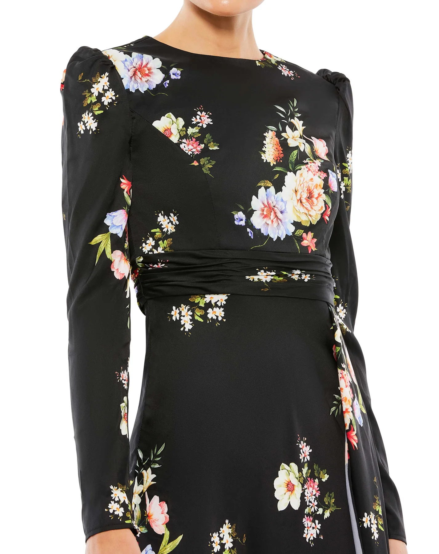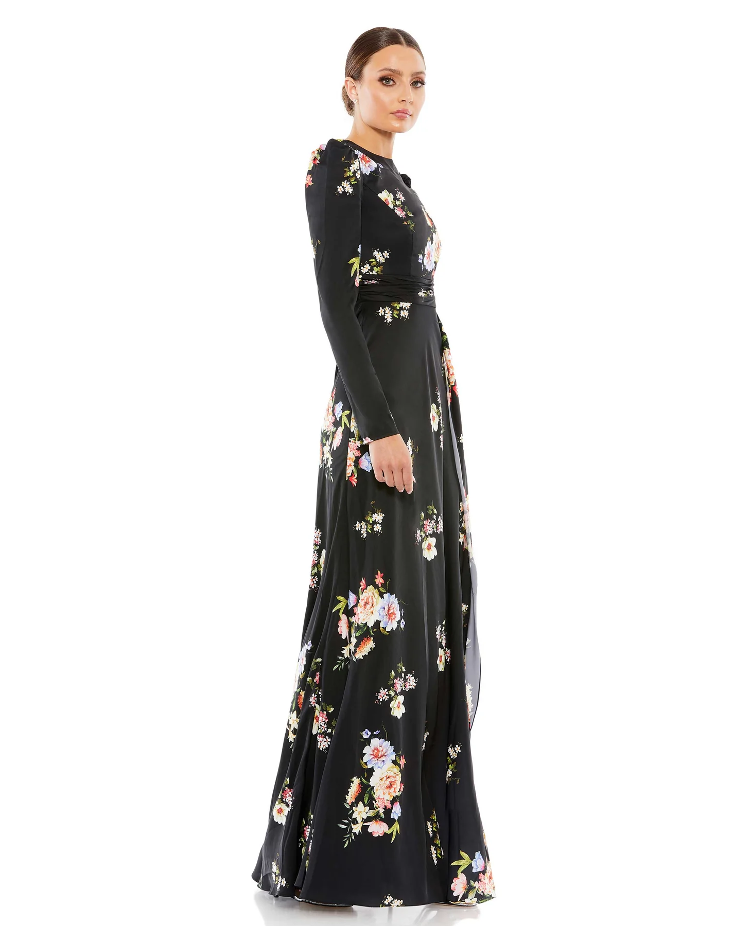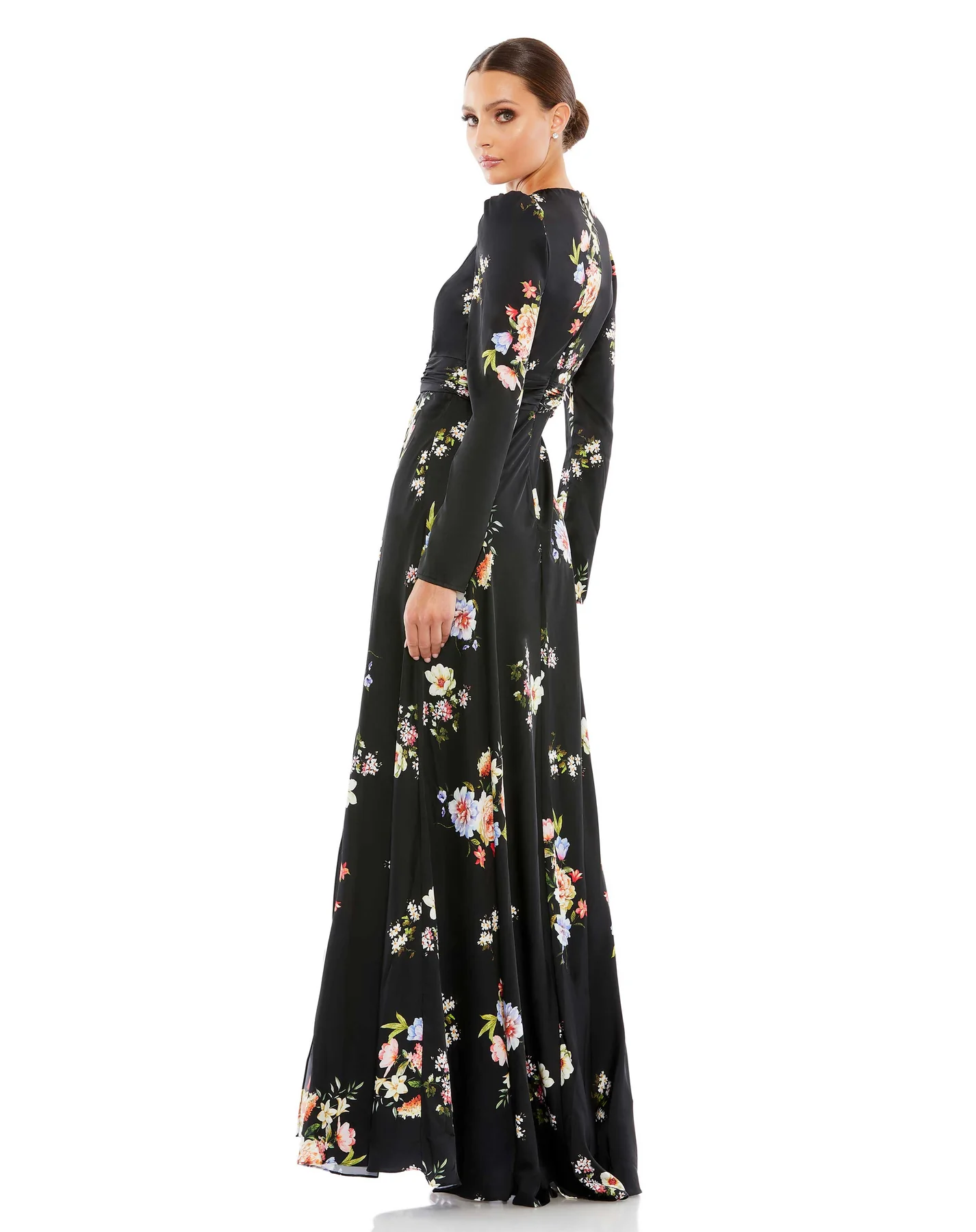 HIGH NECK LONG SLEEVE FAUX WRAP GOWN