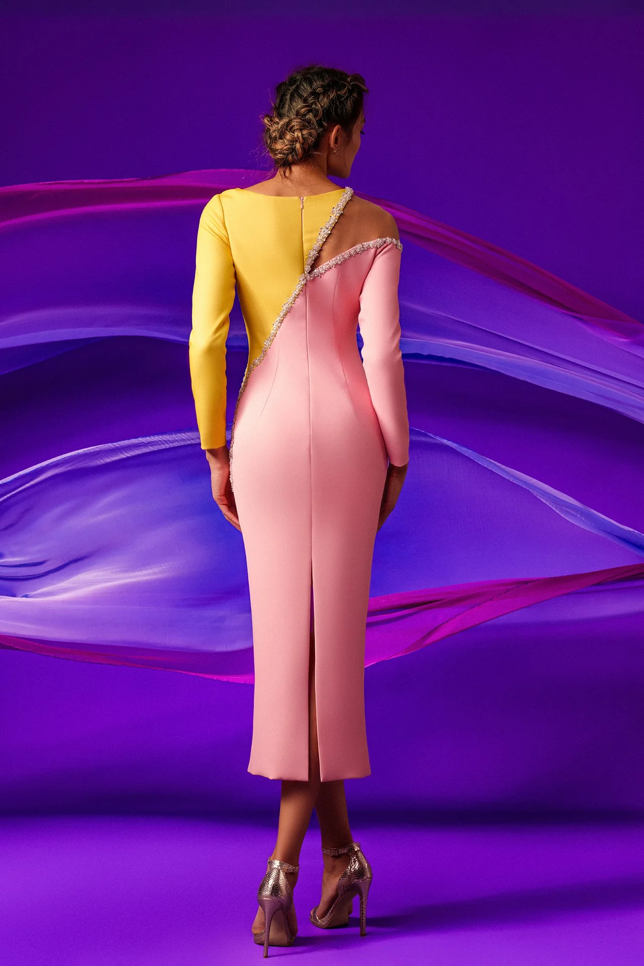 Ice pink and yellow asymmetric crepe midi dress with a sheer shoulder to separate yellow and ice pink with straps of Swarovski stones from shoulder to waist asymmetrical. Amazing design dress look with one black and one white long sleeves and one sheer shoulder with on its back middle slit with a small zipper.