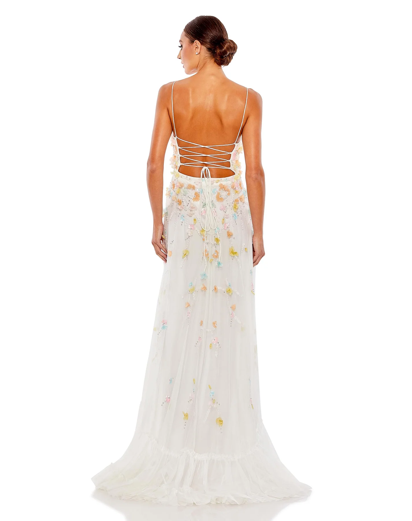 BEADED 3D FLOWER CAMI RUFFLED HIGH LOW LACE UP GOWN