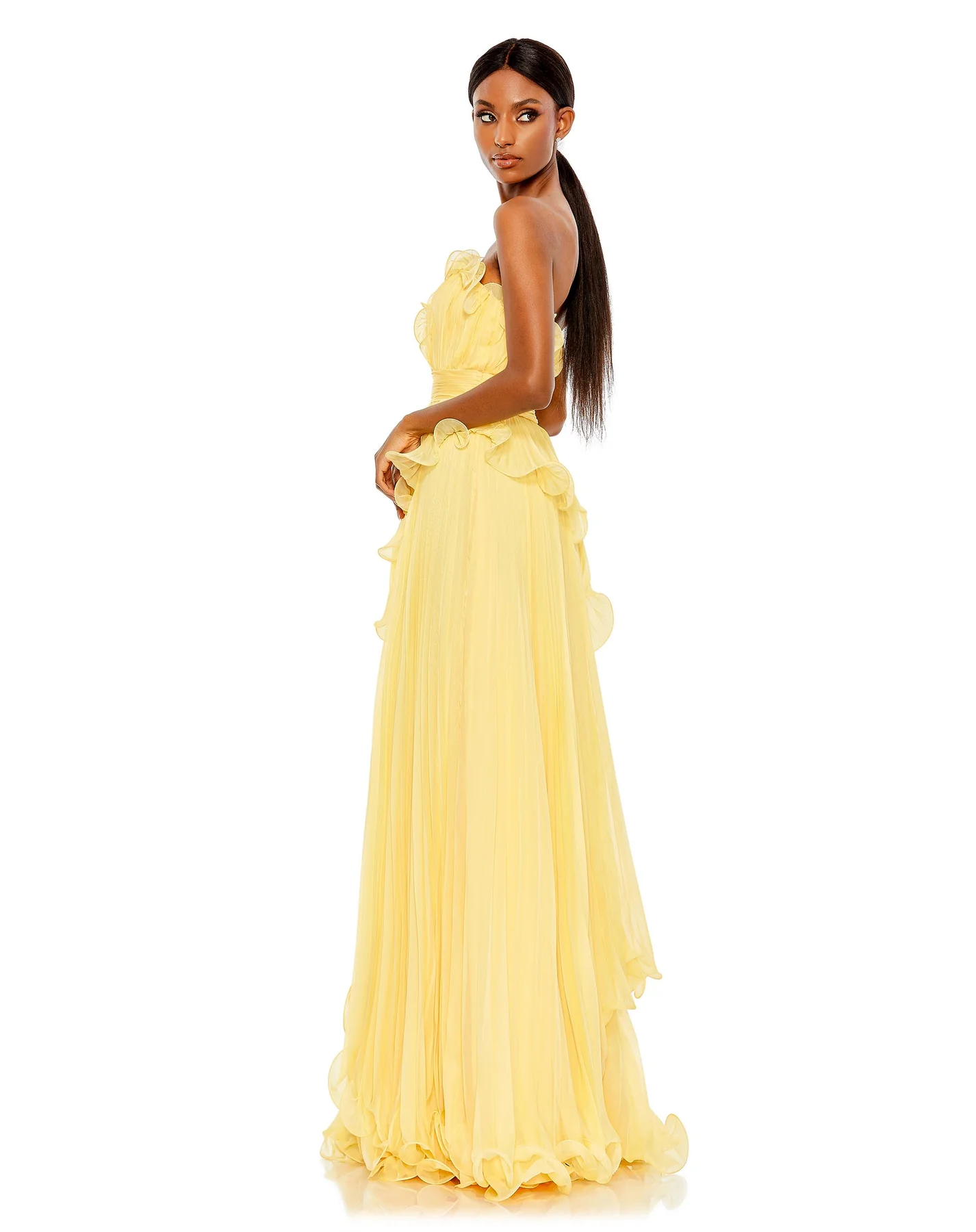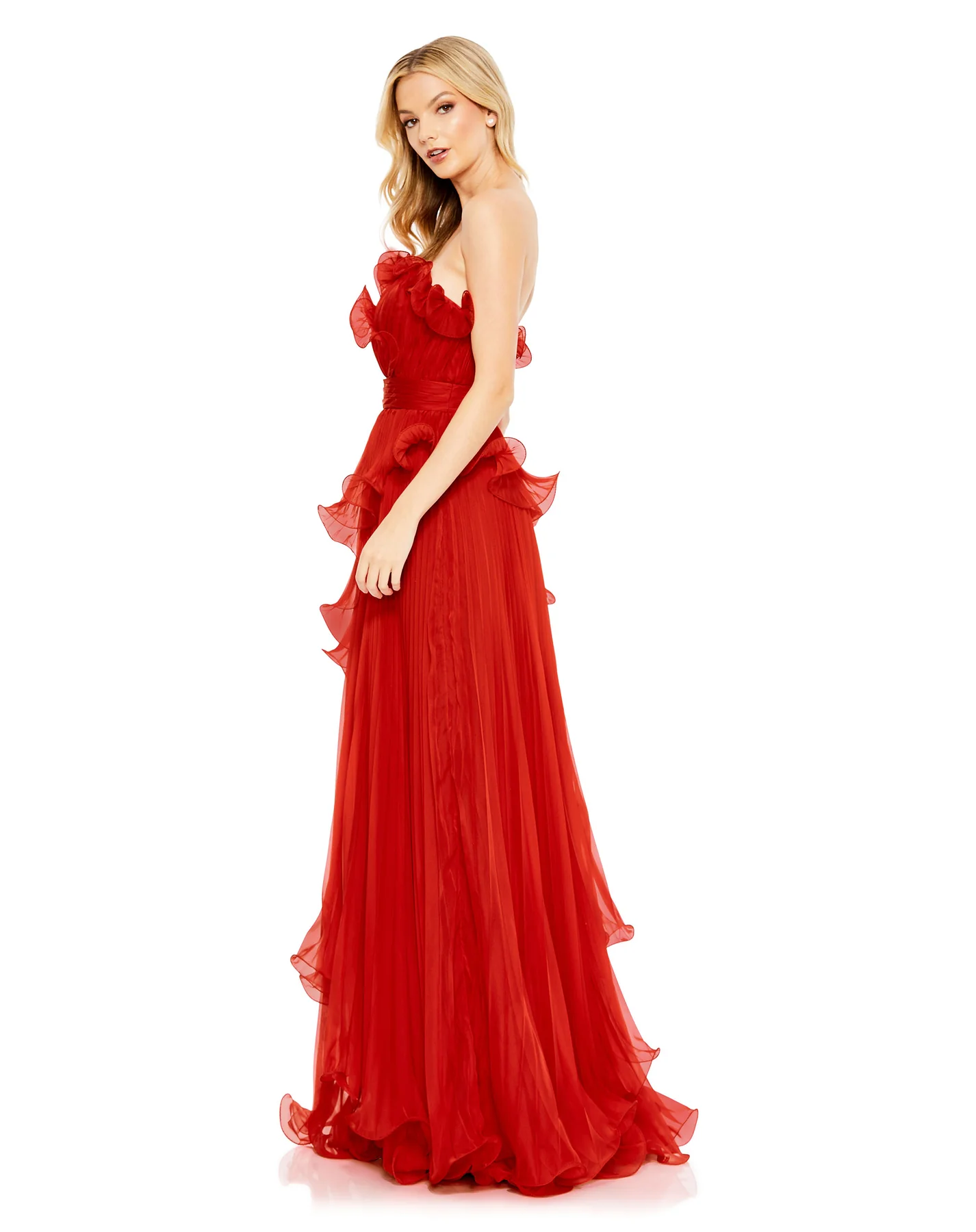 PLEATED TIERED RUFFLED STRAPLESS GOWN