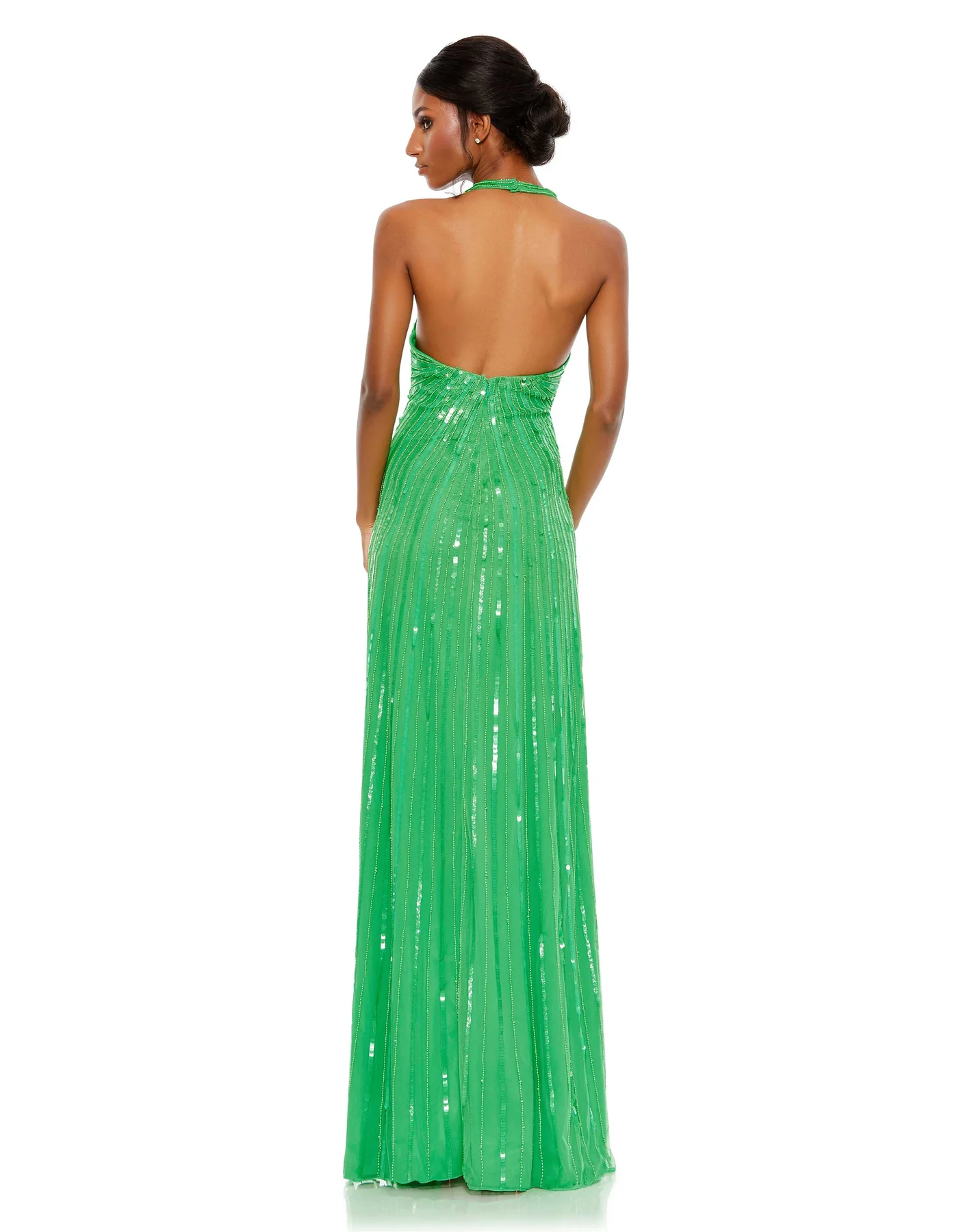 Take pictures—and more pictures—to show off how fabulous you look in our halter gown embellished with rays of sequins and beads. The dress’ sleek, modern cut, shimmering detail, and deep V-neckline ensure you take center stage.