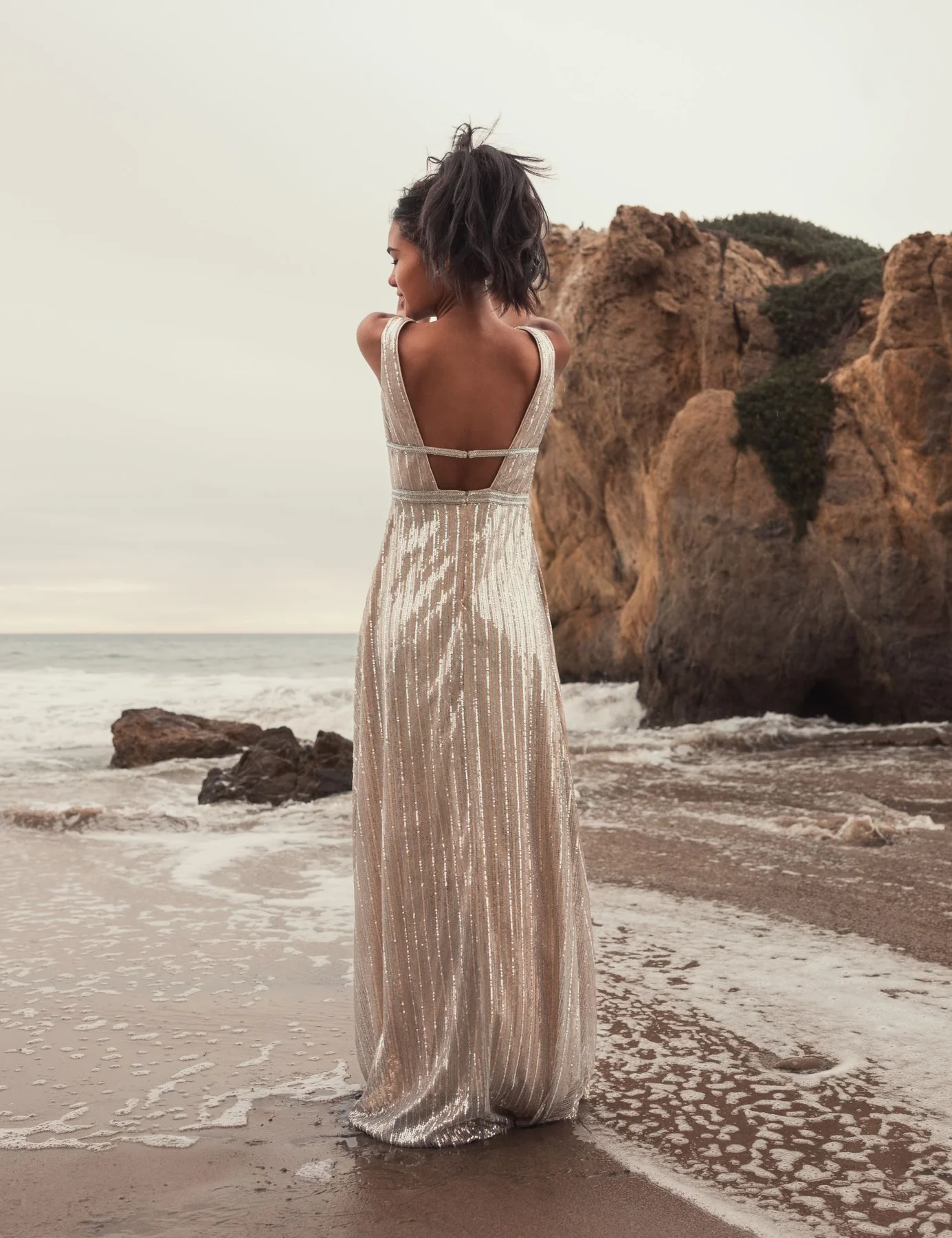 METALLIC SEQUINED PLUNGE NECK GOWN