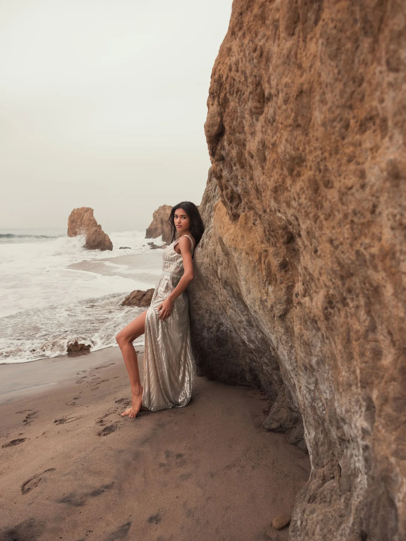 This fully sequined metallic gown features a plunging neckline with a sheer mesh inset, an open back, and a floor-sweeping skirt with a sexy thigh-high slit.