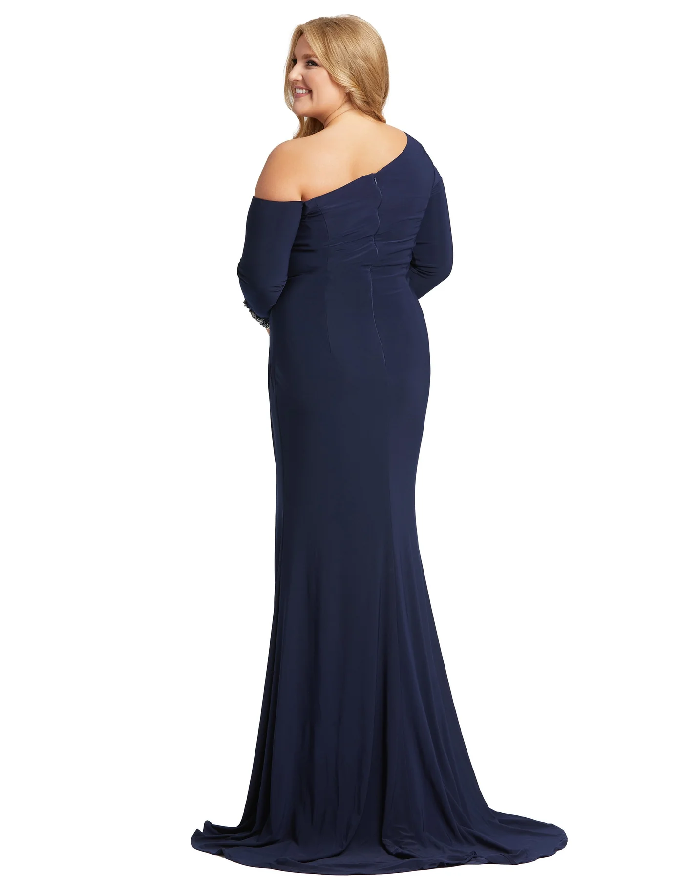 - Asymmetric off-the-shoulder neckline