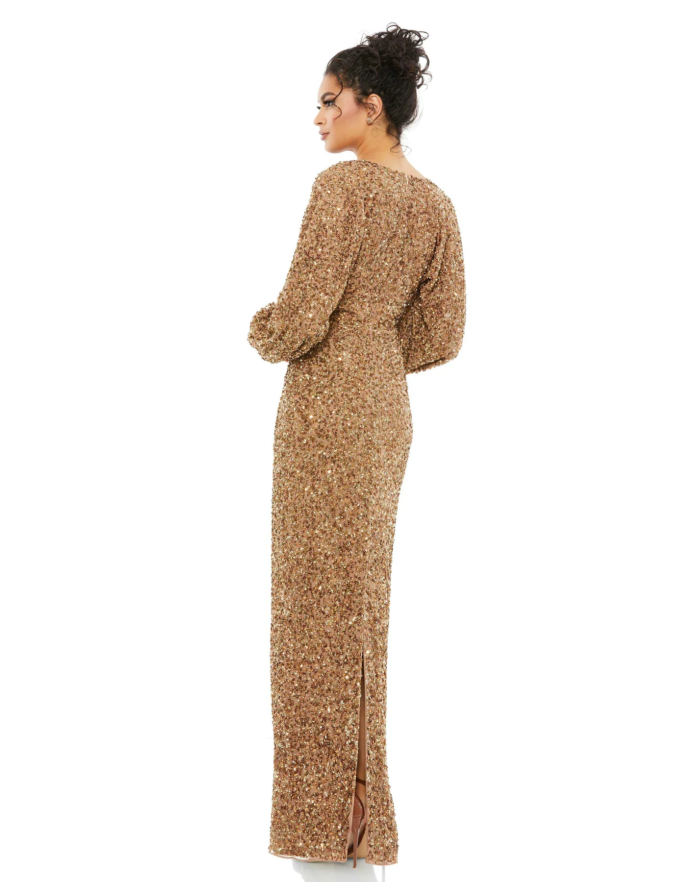 SEQUINED PUFF SLEEVE V NECK GOWN
