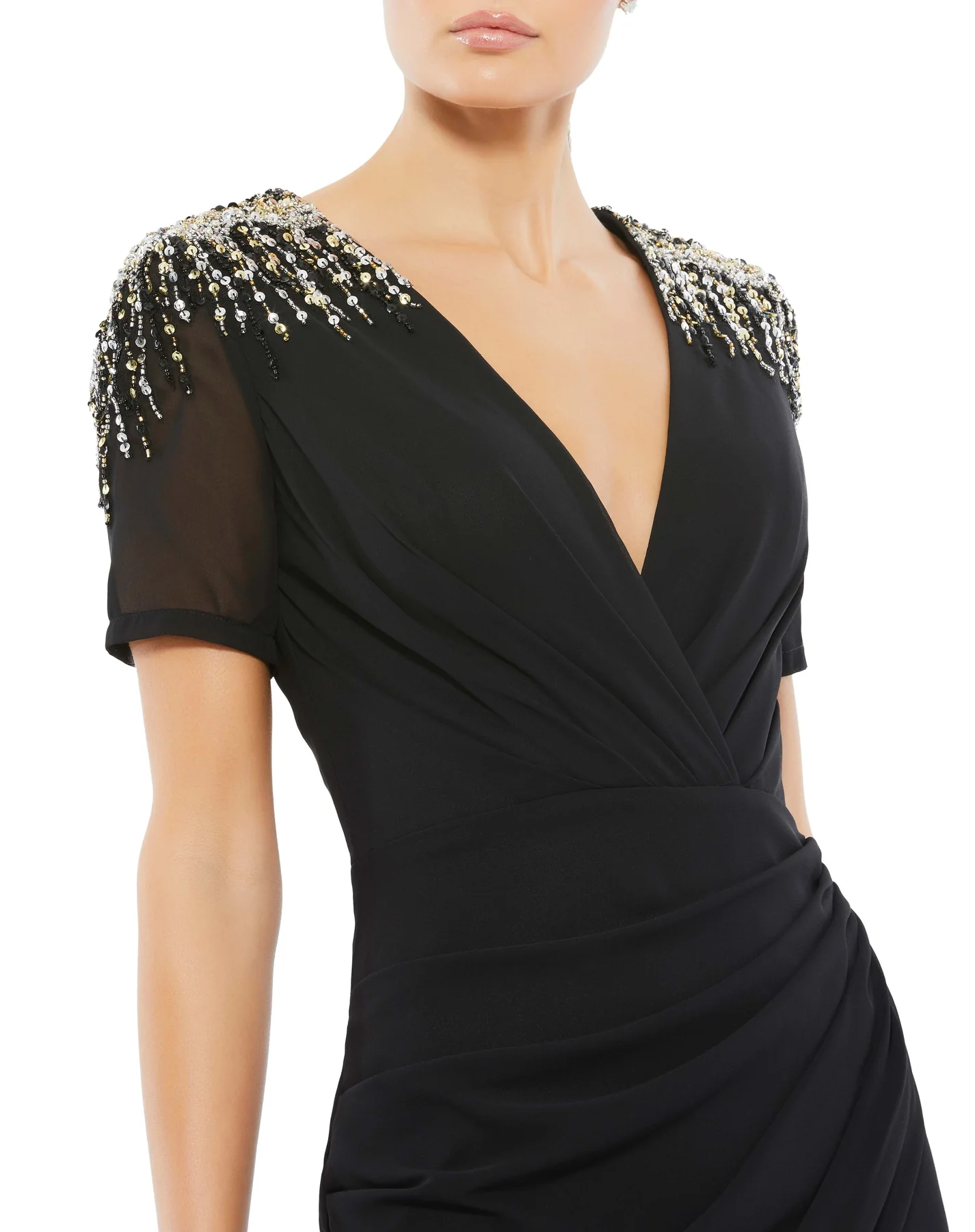 SEQUINED EMBELLISHED SHOULDER EVENING GOWN
