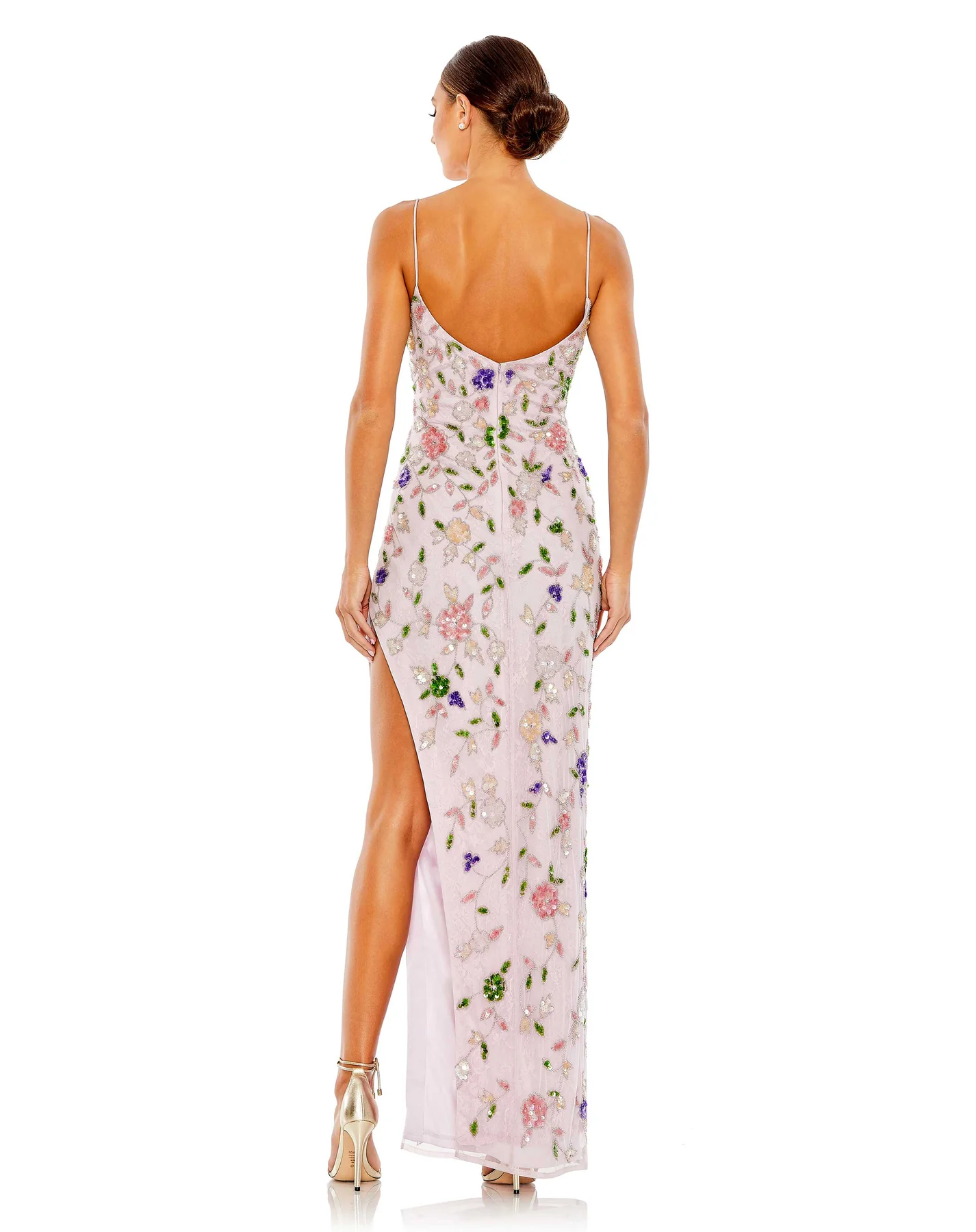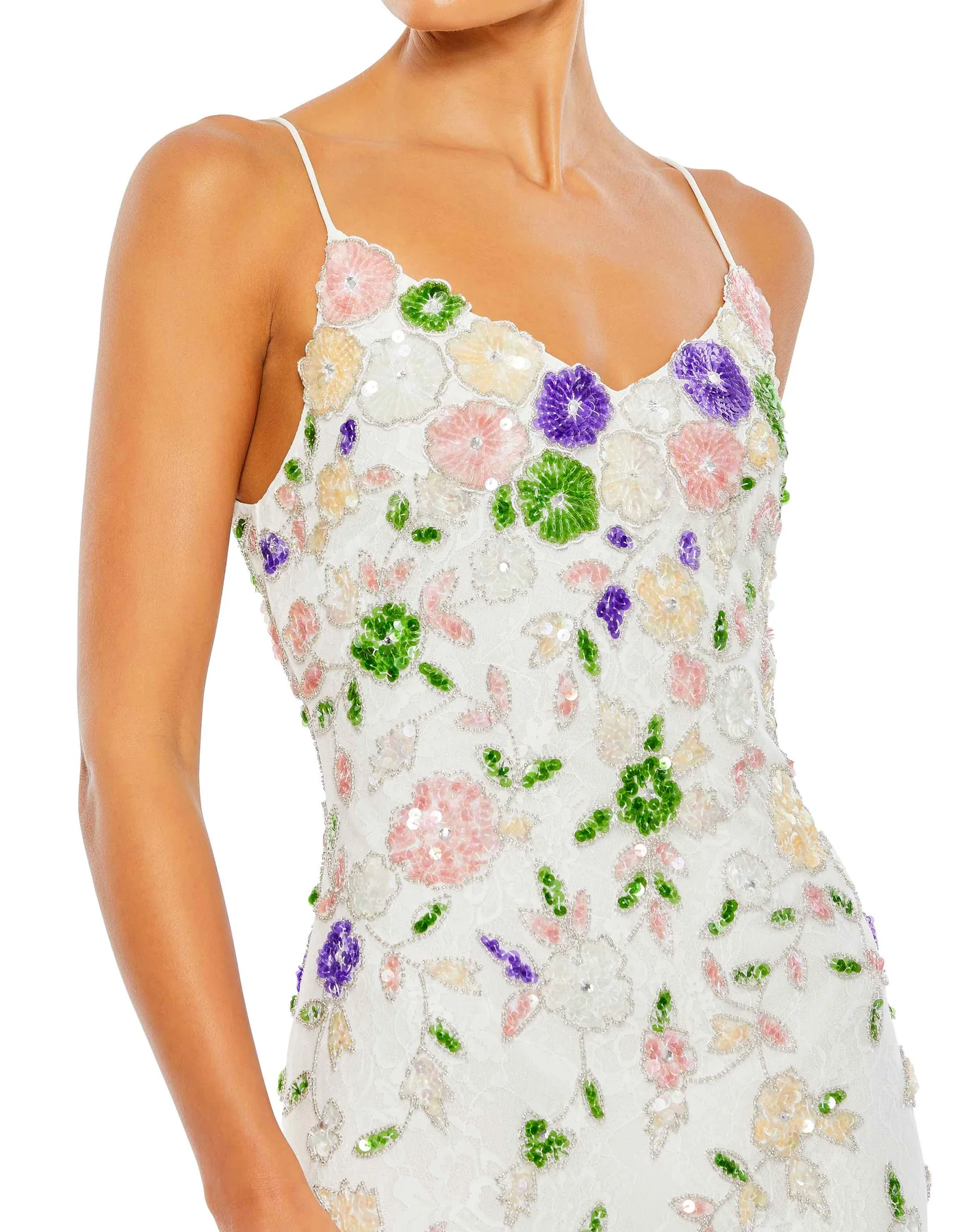 - Allover floral pattern composed of hand-stitched sequins and beading