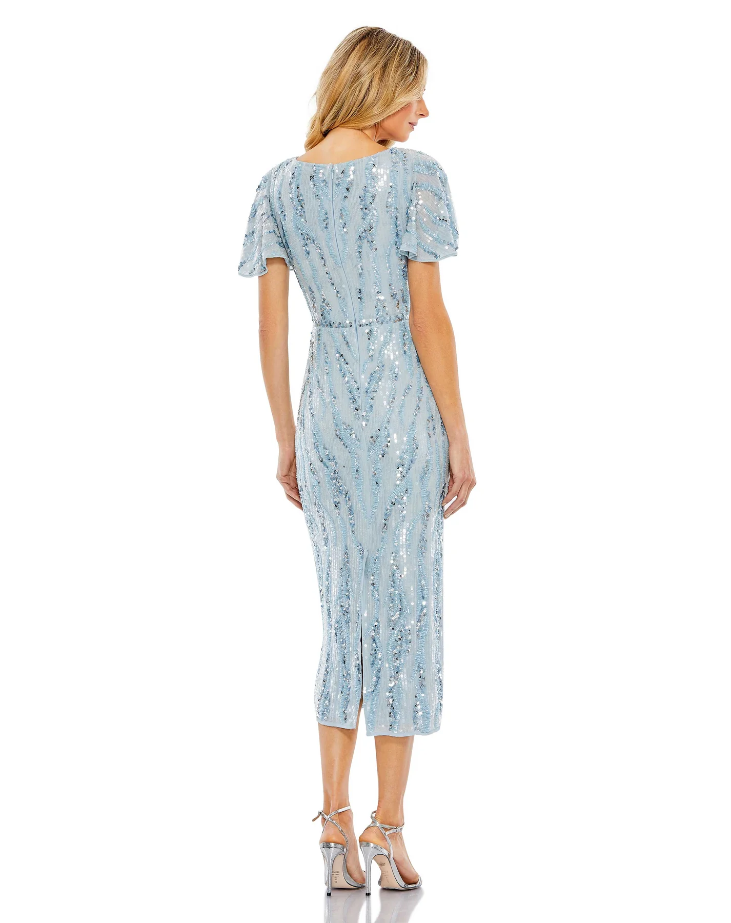 SEQUINED V NECK FLUTTER SLEEVE TEA LENGTH DRESS