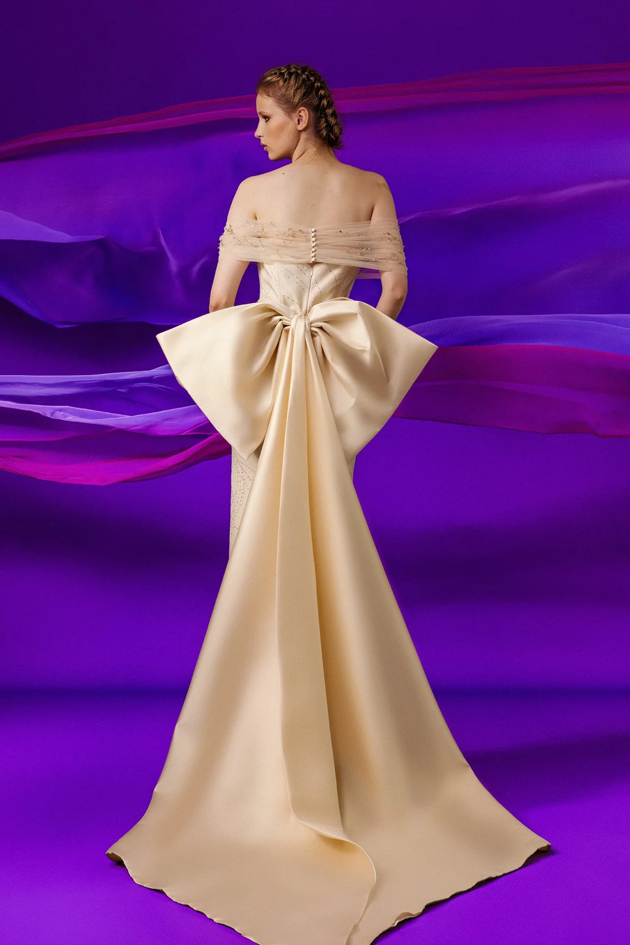 Elegant off-shoulder Jacquard Ivory and Gold straight evening dress with a sensual plunging v-neckline with a tulle embroidered with the same pattern of the jacquard. This feminine dress is defined on the waist with an elegant thin belt that extends to the back with an original flagrant bow where at the node surges boundlessly a train of sweep length. This dress is all you need for your evenings and wedding nights!