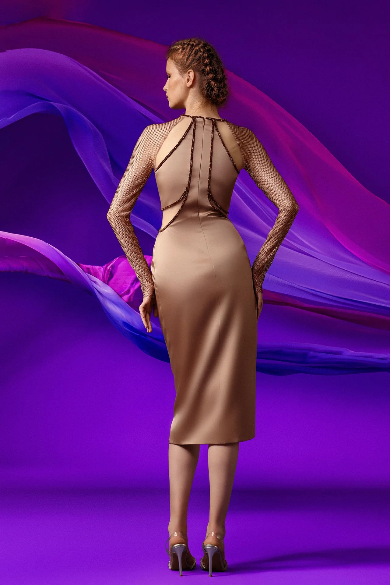 A satin champagne midi dress with Black Swarovski crystals delimiting the edges. The sleeves are mode of Swarovski crystals net. The opening on the hips and the thigh-high slit make it look glamorous. This impressible dress is perfect for holiday part, or any event.