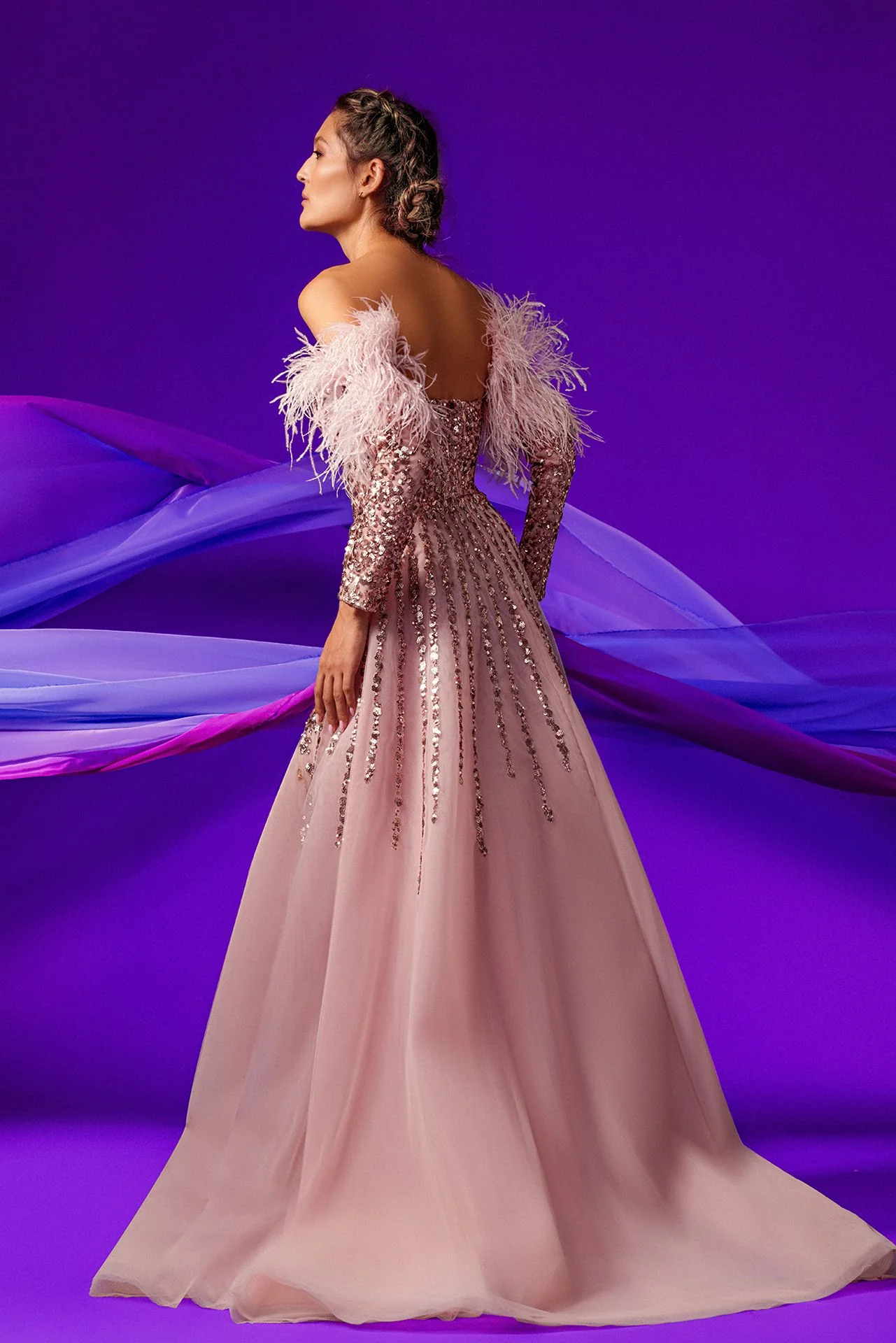 Splendid Sweetheart marvelous sequins embroidered tulle evening dress with its thigh-high slit sparkling from thousand miles. Very original with its detached sleeves ornamented on the shoulder with floaty pink feathers. The plunging backline is complemented on the waits with a sweptback voluminous tulle over-skirt embroidered with starlight pattern sparkly sequins. This original dress is perfect for holiday party and festive attire.
