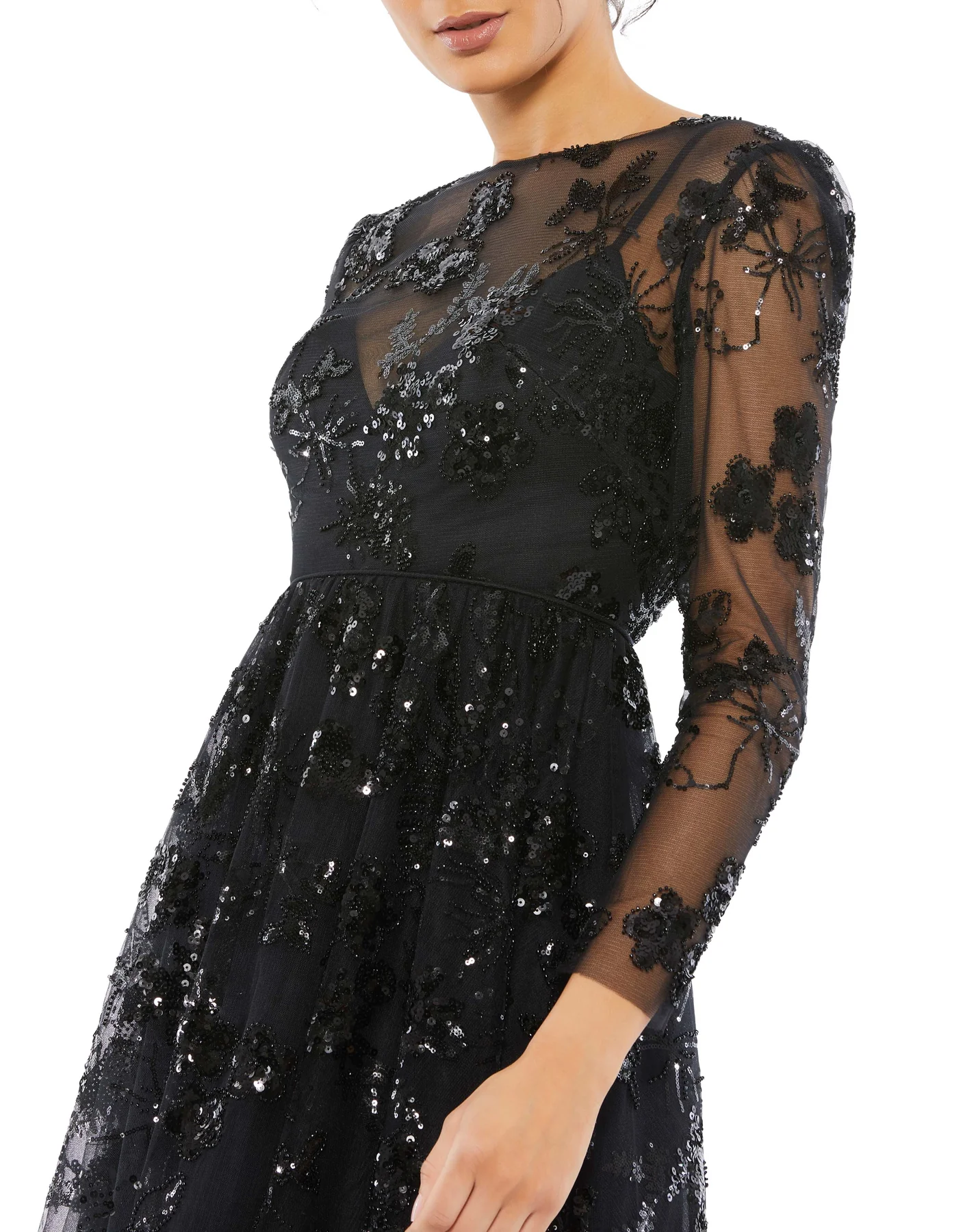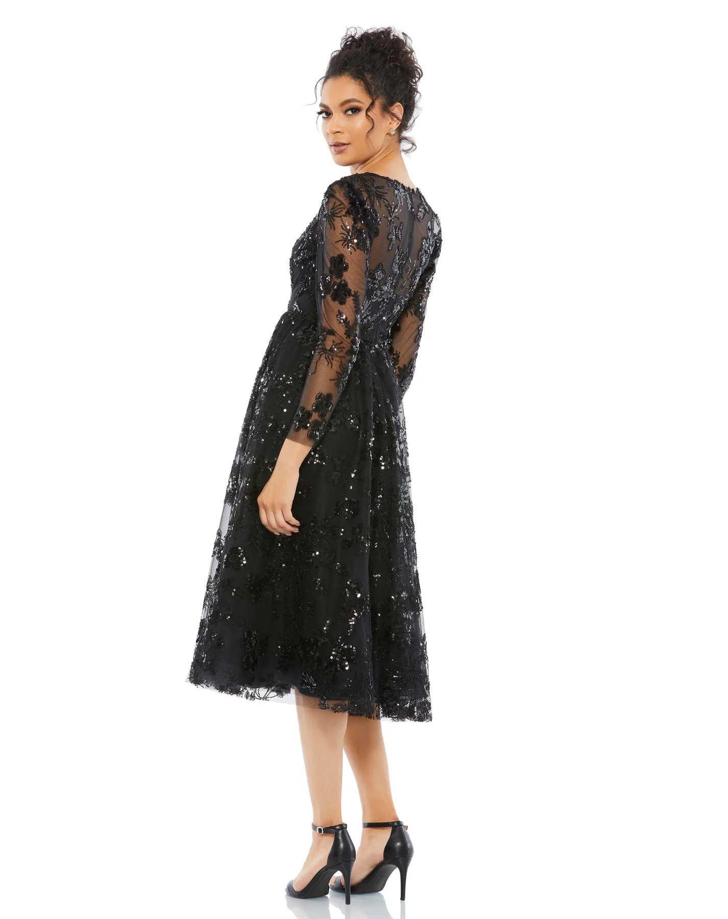 EMBELLISHED ILLUSION LONG SLEEVE MIDI DRESS