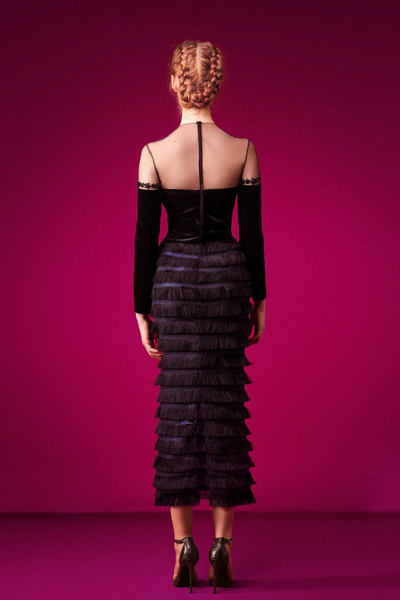 Black velvet sweetheart neckline top on a sheer black tulle with a fine line of handmade embroidery on the bust denoting the curves of the bust and delimiting the long velvet sleeves on the top. This finely designed top shows a sheer tulle neckline and a velvet corset with a horizontal strip of buttons on the back. The black and navy ballerina length skirt is ruffled indefinitely from waist till the end with cascading fringes on all layers. This amazing skirt has a middle black slit. You can wear it at any formal occasion or event.