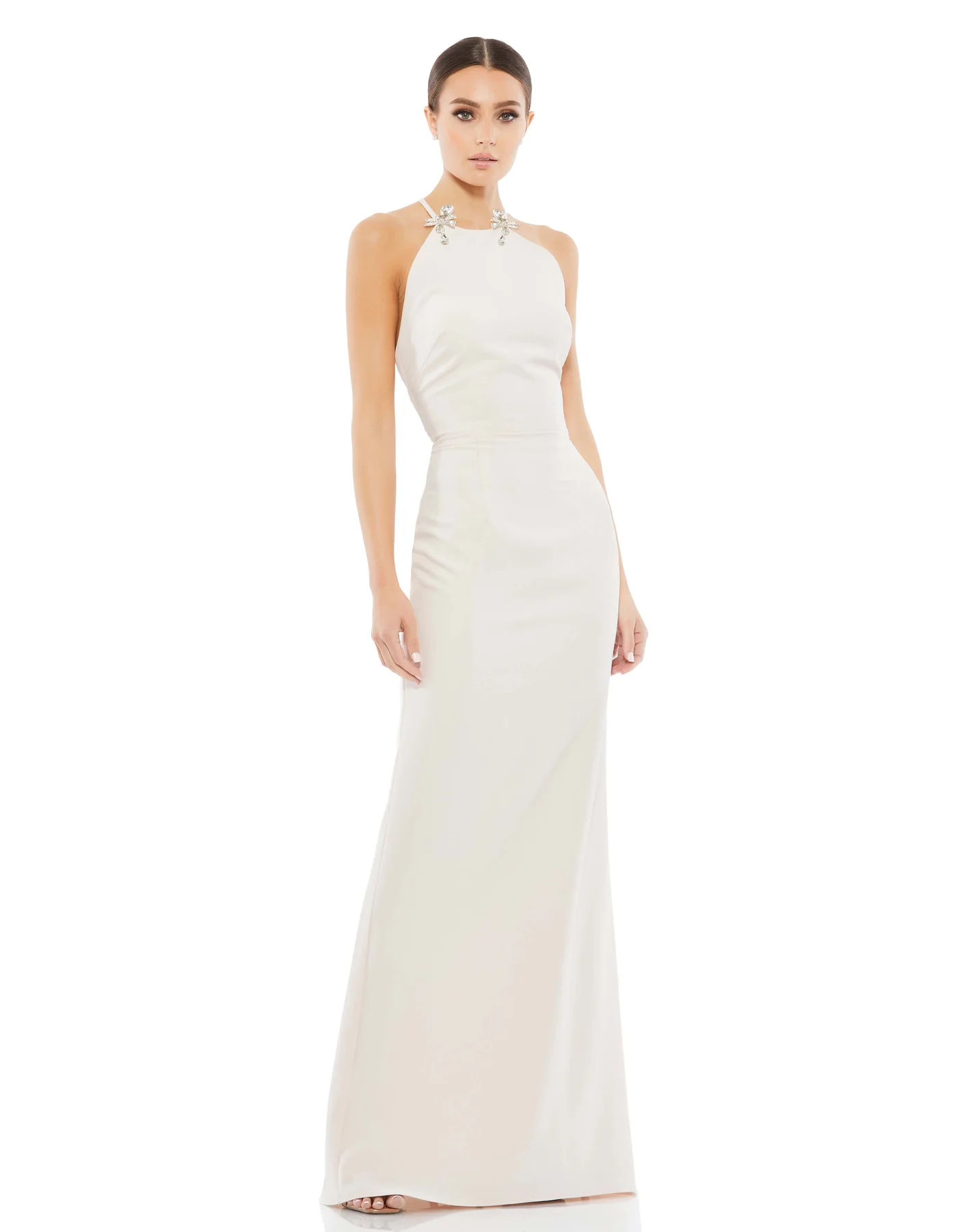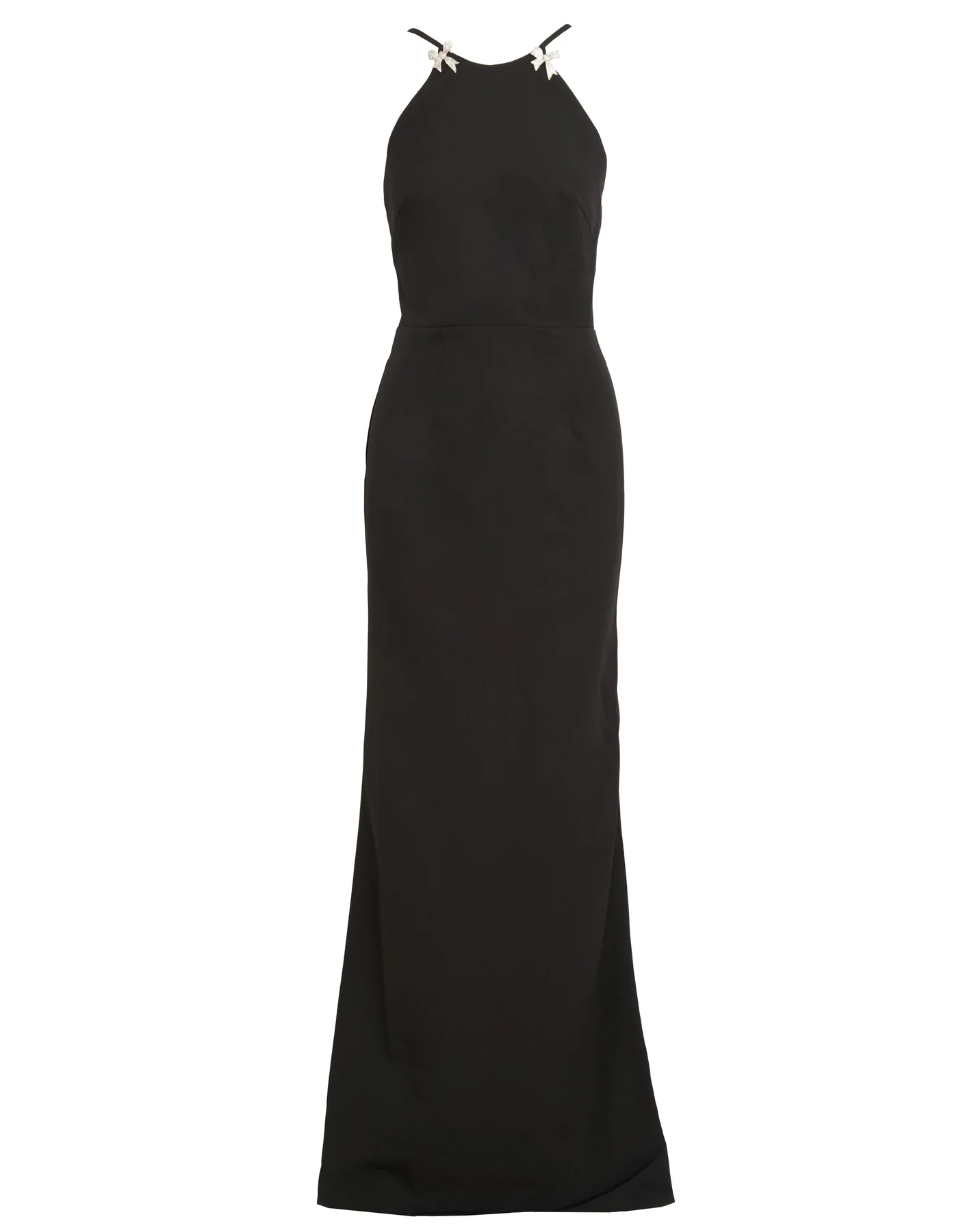 BOW HALTER CRISS-CROSS COLUMN GOWN