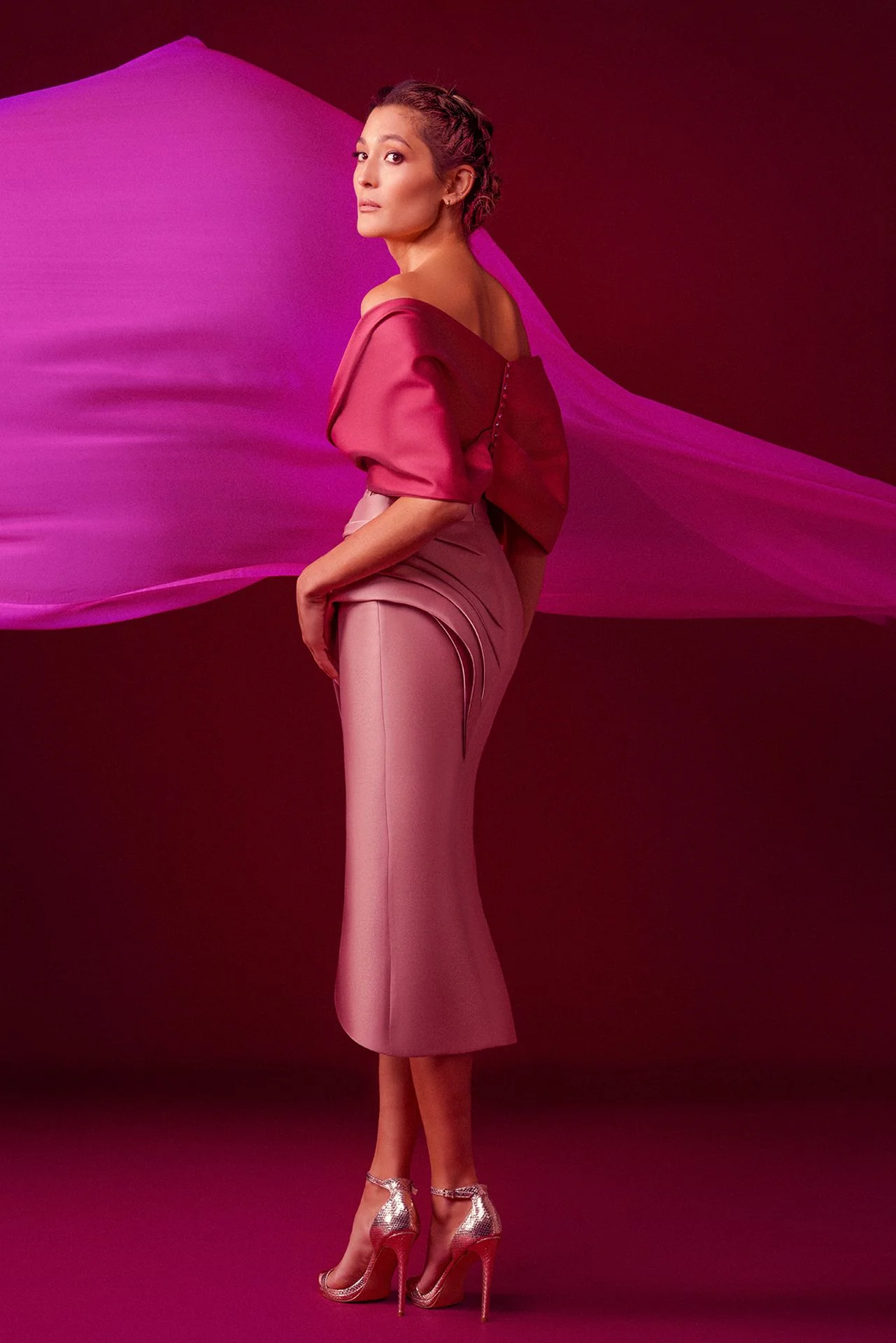 Off-shoulder crossed crimson bow covering an entangled corded transparent ballerina corset with a bust slit neckline embroidered with rectangular sequins and nacreous pearls on the edge of the slit. The crossed bow is lengthened to the back in a cape shape like, with a strip of buttons in the middle. The midi draped ballerina cady skirt is defined with a tiny belt on the waist and is draped and wrapped over an asymmetrical slit. This luxurious duet shall be your ideal choice for these holidays.