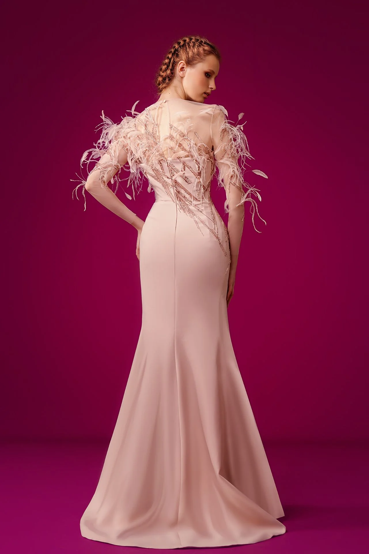 Soft pink evening dress with sheer tulle on the bust covered with sequins, Swarovski crystals and feather and plumage. The top with long sheer sleeves, exhibits an asymmetrical line pattern embroidery that open up on a thigh-high slit. The back is simple and reflects the beauty of the front and flow to the floor in a sweep length.