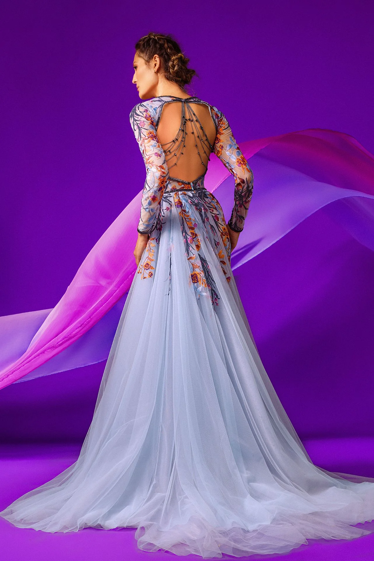 Plunging Sweetheart baby-blue corset with attached sheer tulle sleeves, ornate with silk embroidery of multicolored floral and foliage patterns on the bust and sleeves. The silk embroidery of navy and baby blue, red and orange is romantic and sensual ornamented with pearls of the same color. This long dress is defined on the waist with a decent navy blue belt of the floral and foliage pattern extend flopping to the floor in a pencil cut with a side thigh-high slit. The back is emptied and ornamented with multilayered crossed pending necklaces, and a voluminous baby sheer tulle over-skirt complete this amazing evening dress.
