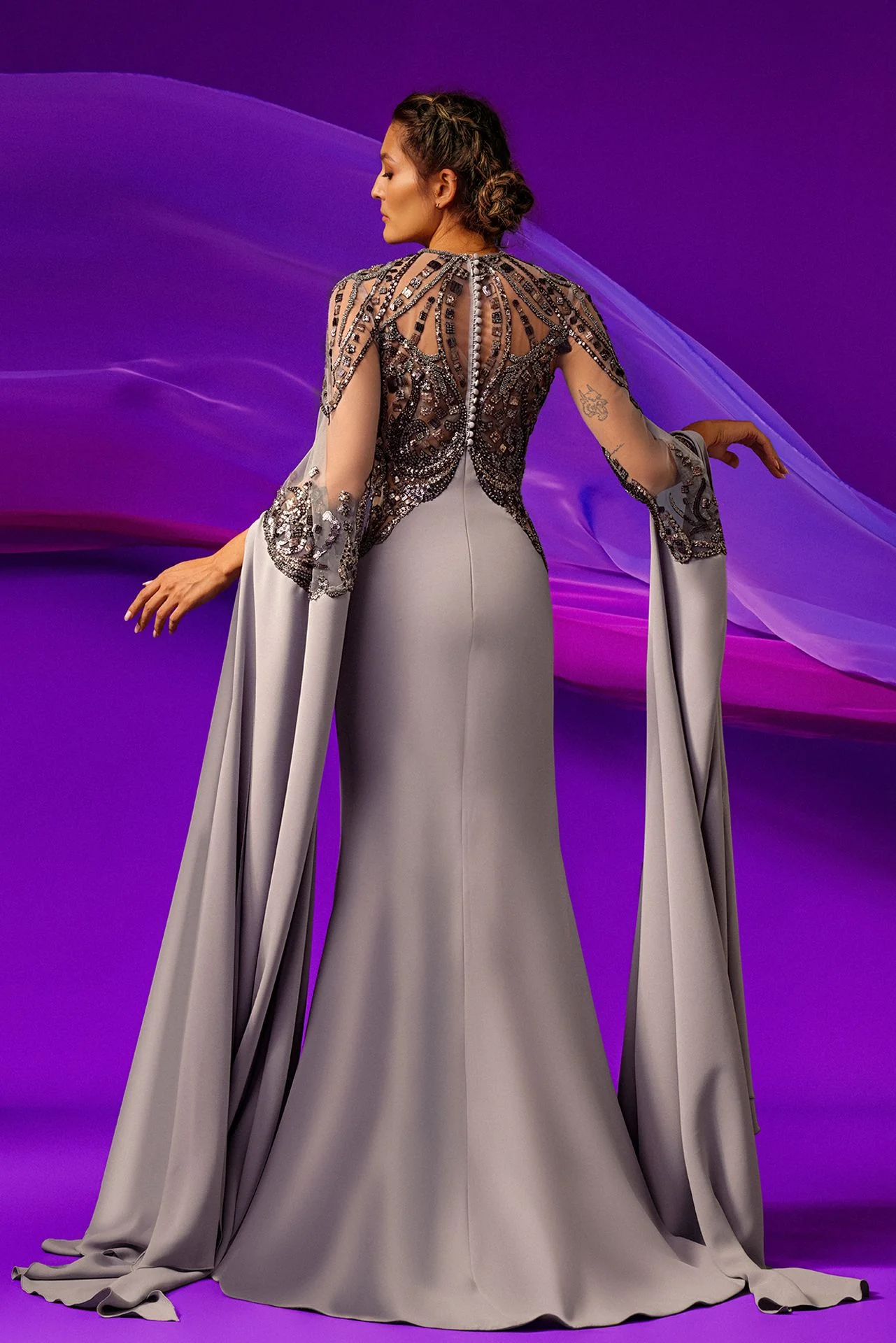 With the magic of antique grey and the look of handmade embroidered tulle evening dress with cape bell sleeve flowing to the floor with ornamented with marvelous geometric embroidery. This Halter dress with a thigh-high slit is a masterpiece stirring hearts on all occasions.