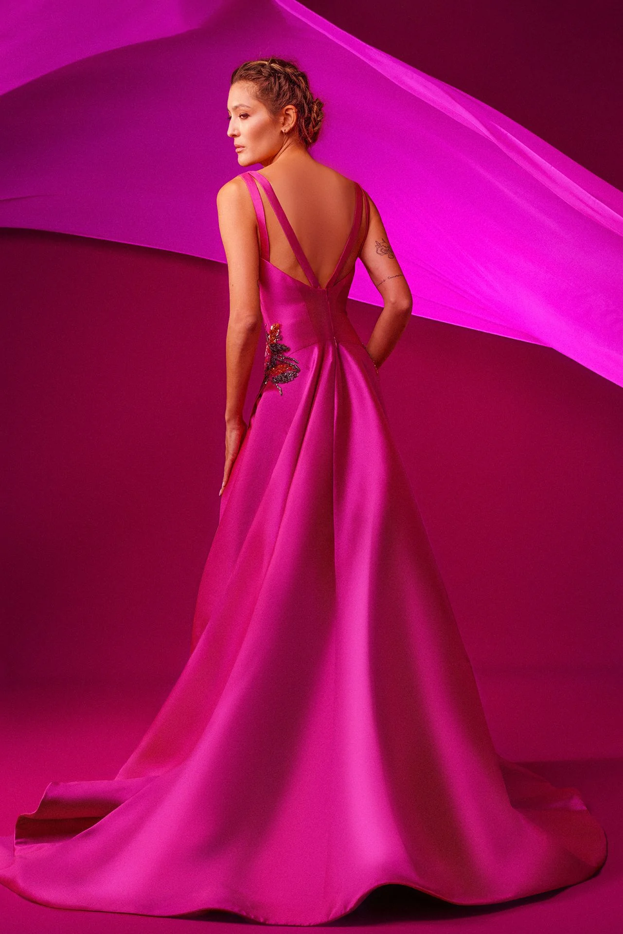 Coquettish plunging V-neck Fuchsia cady evening dress with court length panel train. Amazingly designed with a plunging V-string backline and a zipper on the back-waist. The waist present two diamonds shape opening with bold floral pattern embroidery on the waist. An asymmetrical waist slit gives it a seductive and tantalizing gaze to be filled with wonder and astonishment.