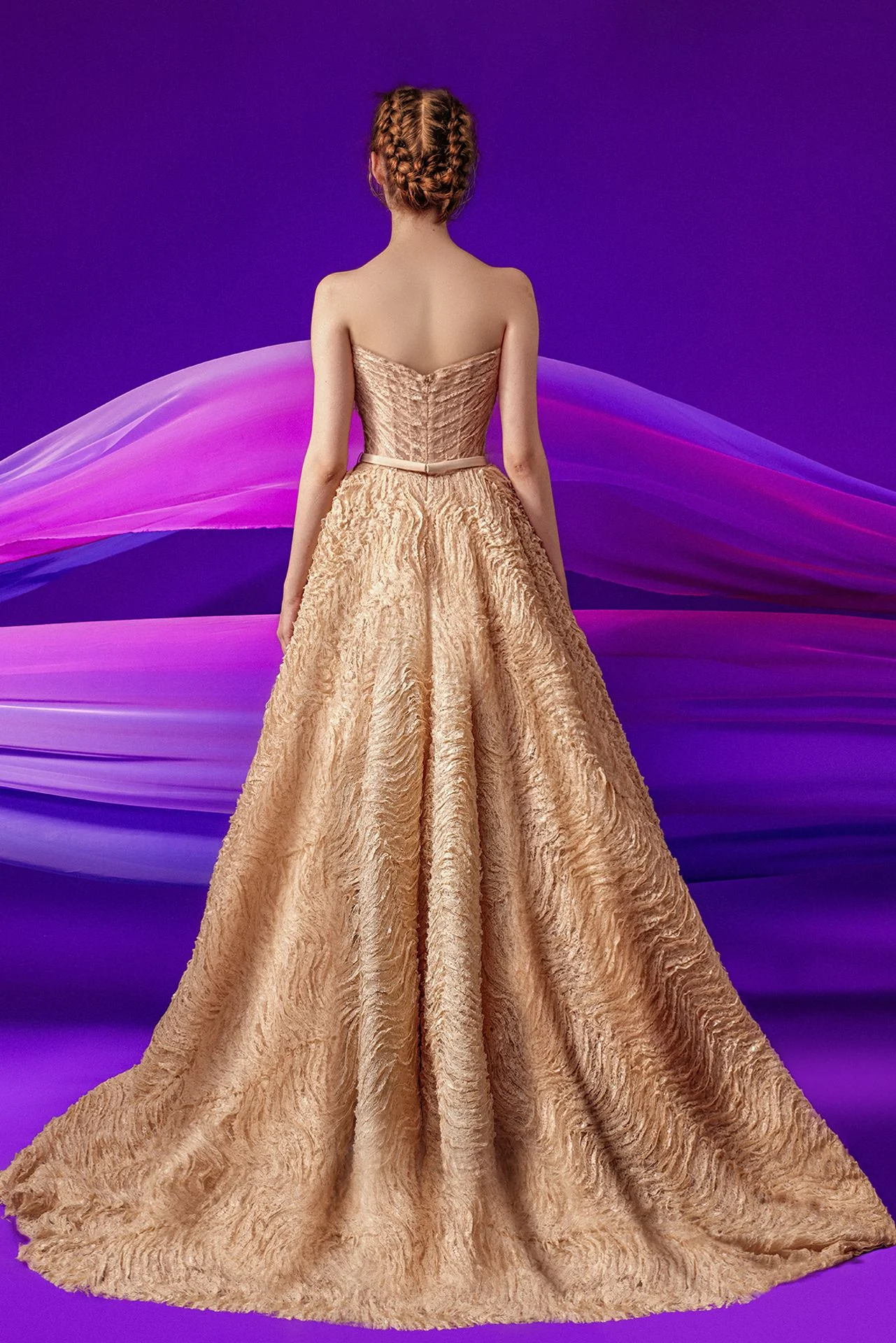 Strapless gown with laser-cut design lace and a corset with a keyhole neckline designed in floral embroidery that is slightly ruffled on the edge of the bust and defined on the waist with a belt. The dress is streaming abundantly to the floor in a court length making your appearance to a great degree. The back is gorgeously asymmetrically bold, with a bonding that goes along the v-backline. The prodigiously wavy laser-cut lace makes this gown a perfect fit to all occasions!