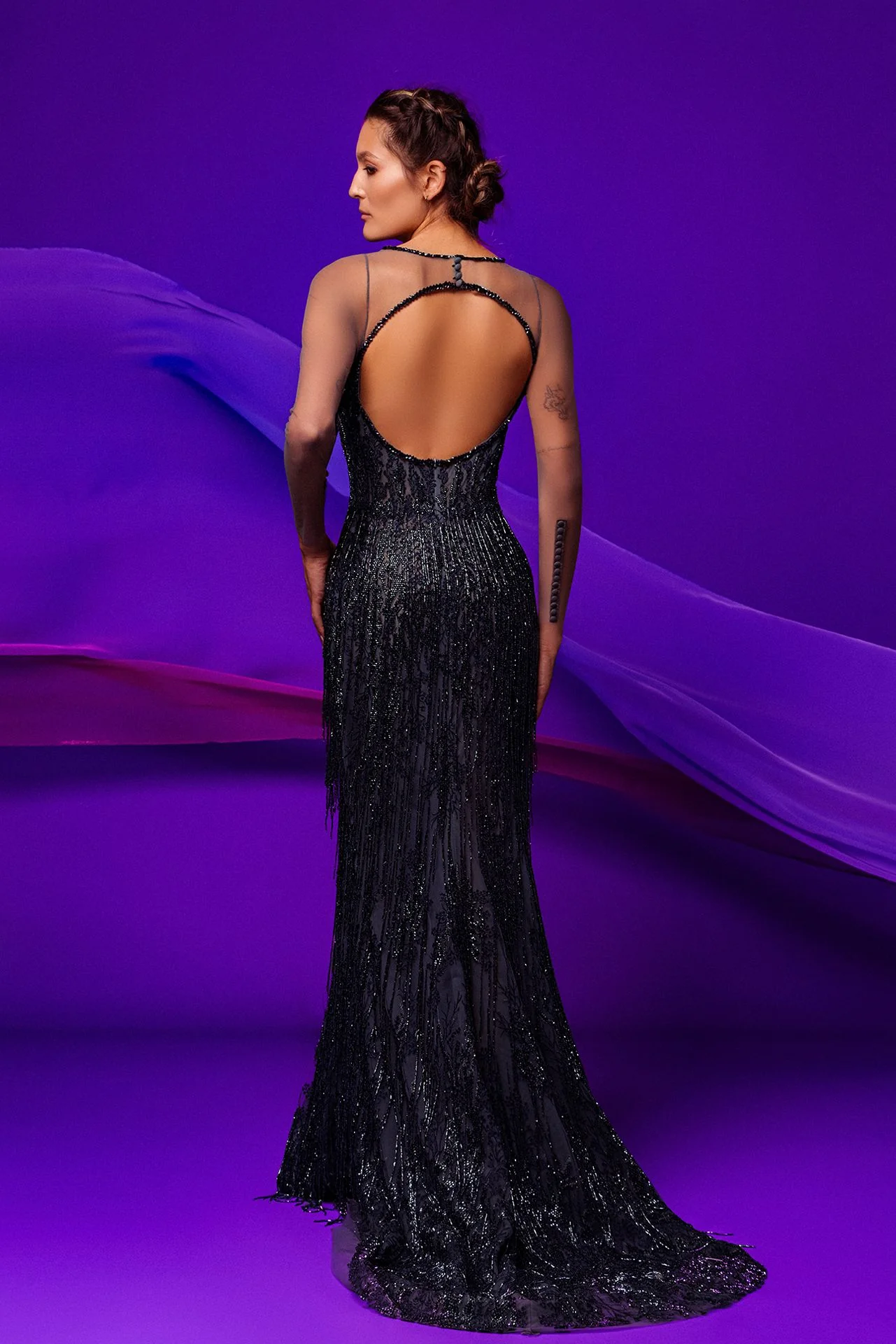 Dramatic evening dress, finely handmade embroidered on its corset with Silenus and its mermaid skirt fringed with Silenus too, flowing to the floor with a noble court train. This circular open-back evening dress is terrific for all kind of events especially with its fine sheer sleeves and its embroidered edges on the crossed neckline. First-class outfit.