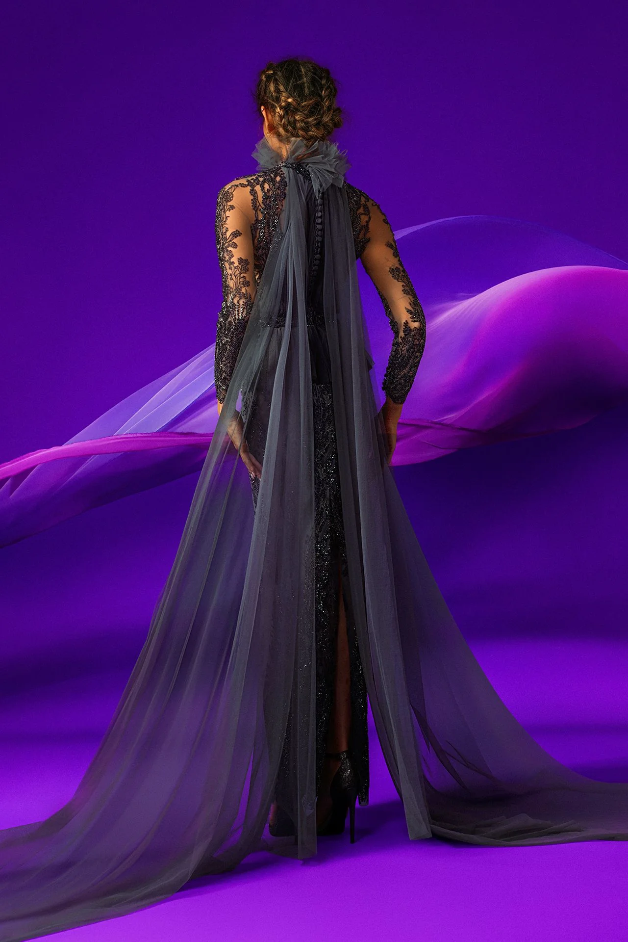 Black tulle embroidered evening dress, with Ruffled neck and a lovely belt on the waist made only of embroidery. Tulle embroidered with Silenus seamless floral pattern on the sheer black sleeves and the long straight cut floor length skirt. From the back on the neck level, two long tulle train-wings like are attached and falling loosely to the floor adding a time of drama and sensuality.