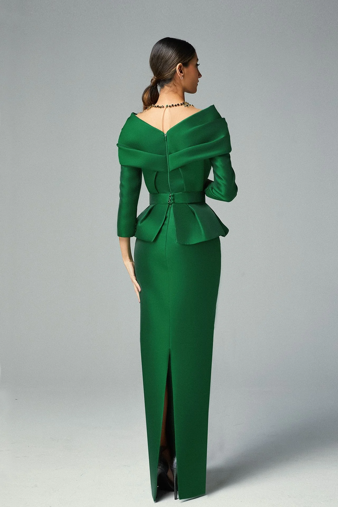Off-shoulder Bow Tie Peplum Cady Emeralds Top with Column Long Skirt
