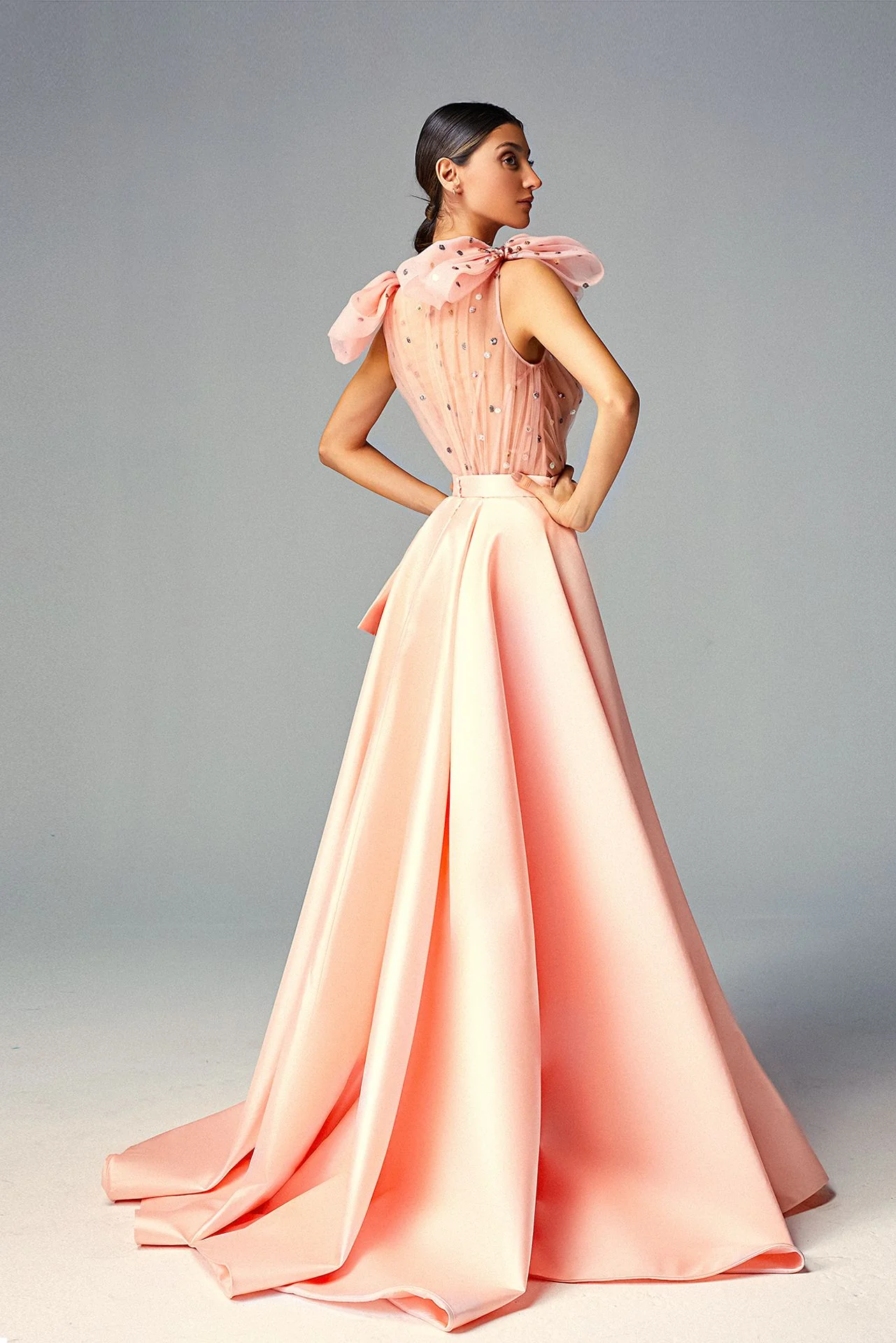 Draped Sequined Carnation Pink Tulle Top & shoulder Bow & Mikado Over Skirt
