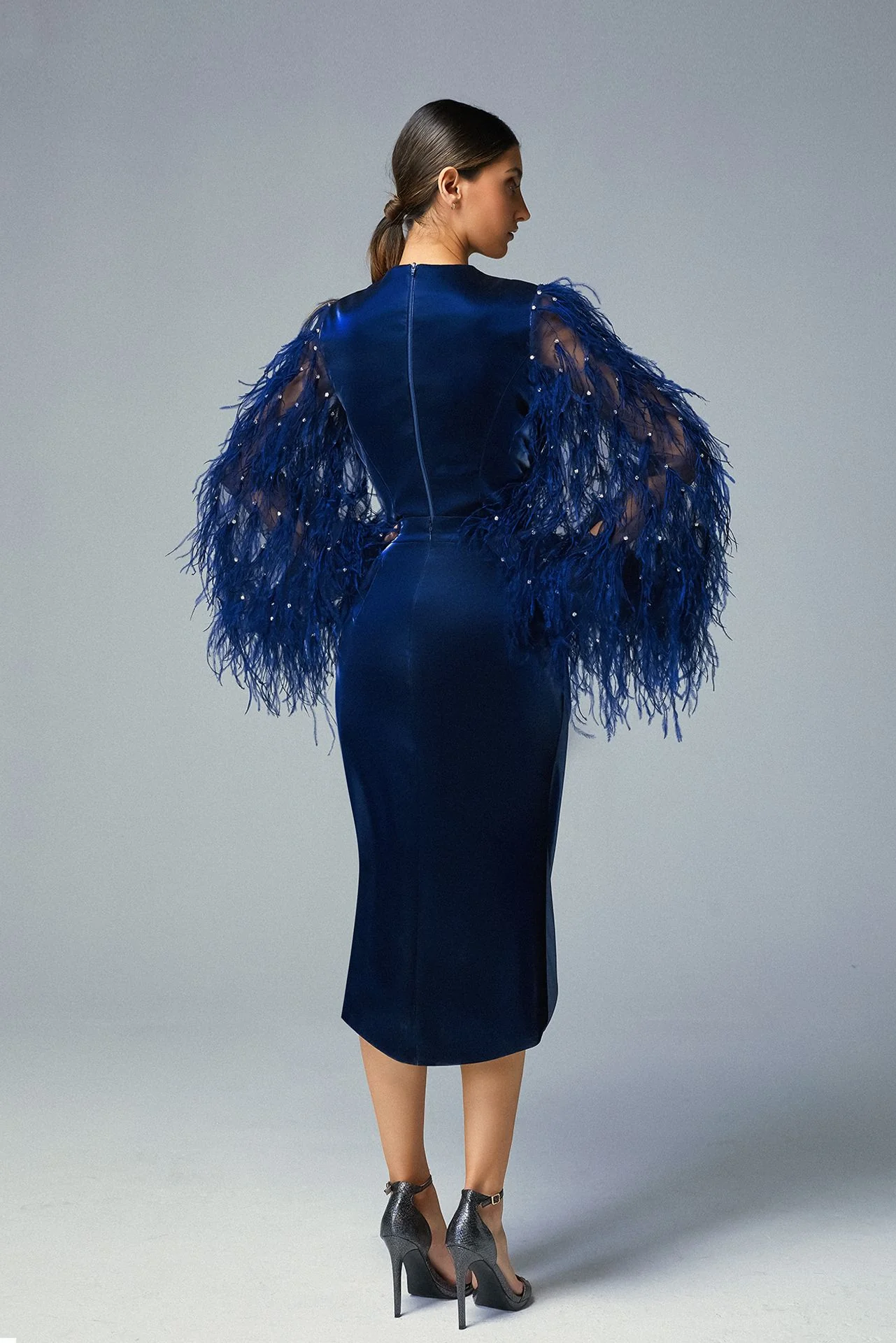 Draped V- Plunging Navy Blue Cady Top Feathered & Embroidered Sleeves & Midi Skirt