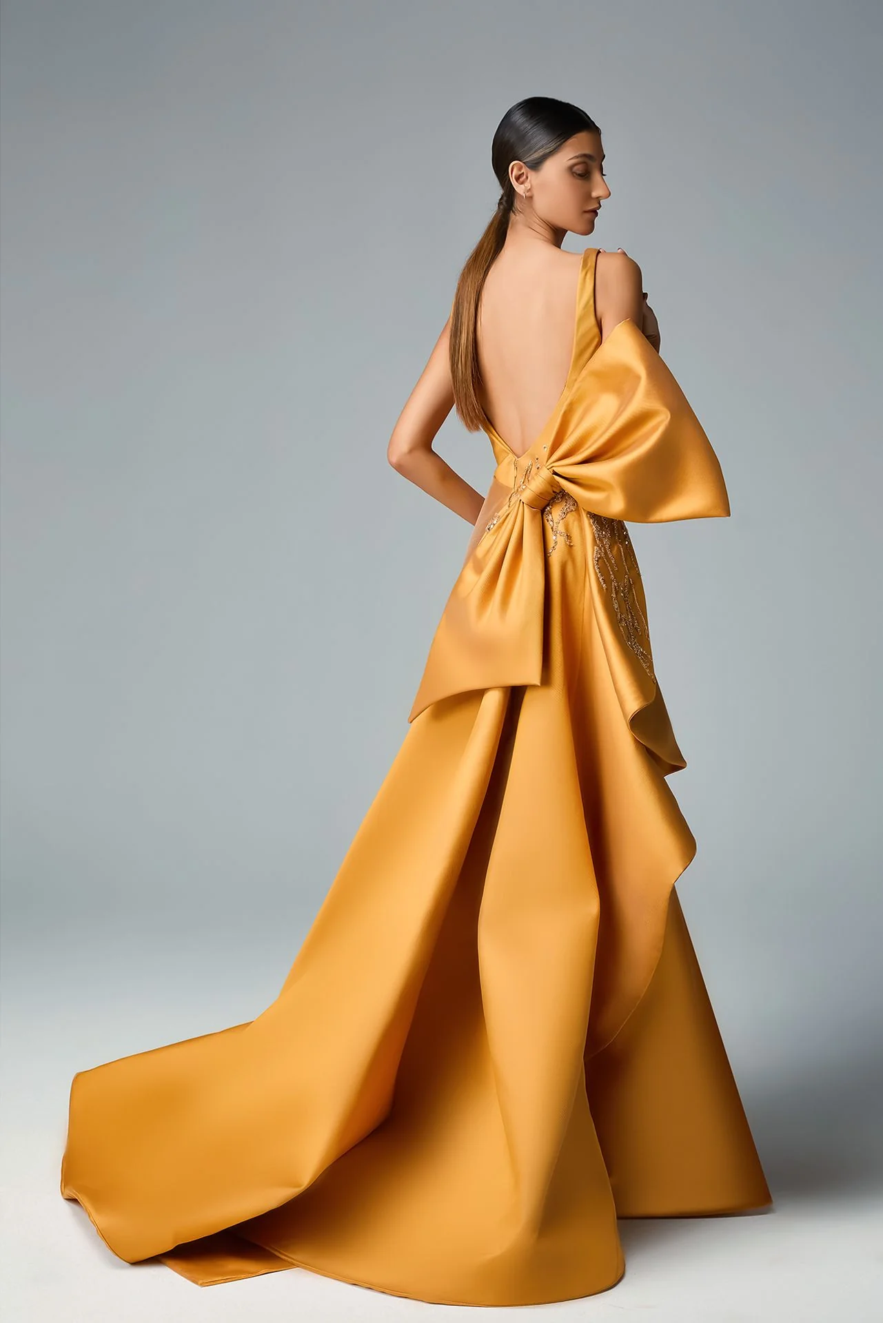 Fashionable square neck of a draped top with side waist handmade Swarovski crystal design and an asymmetric back bow flowing to the floor with a voluminous sweep train... A classy and highly-toned gold champagne cady evening dress with a side slit.