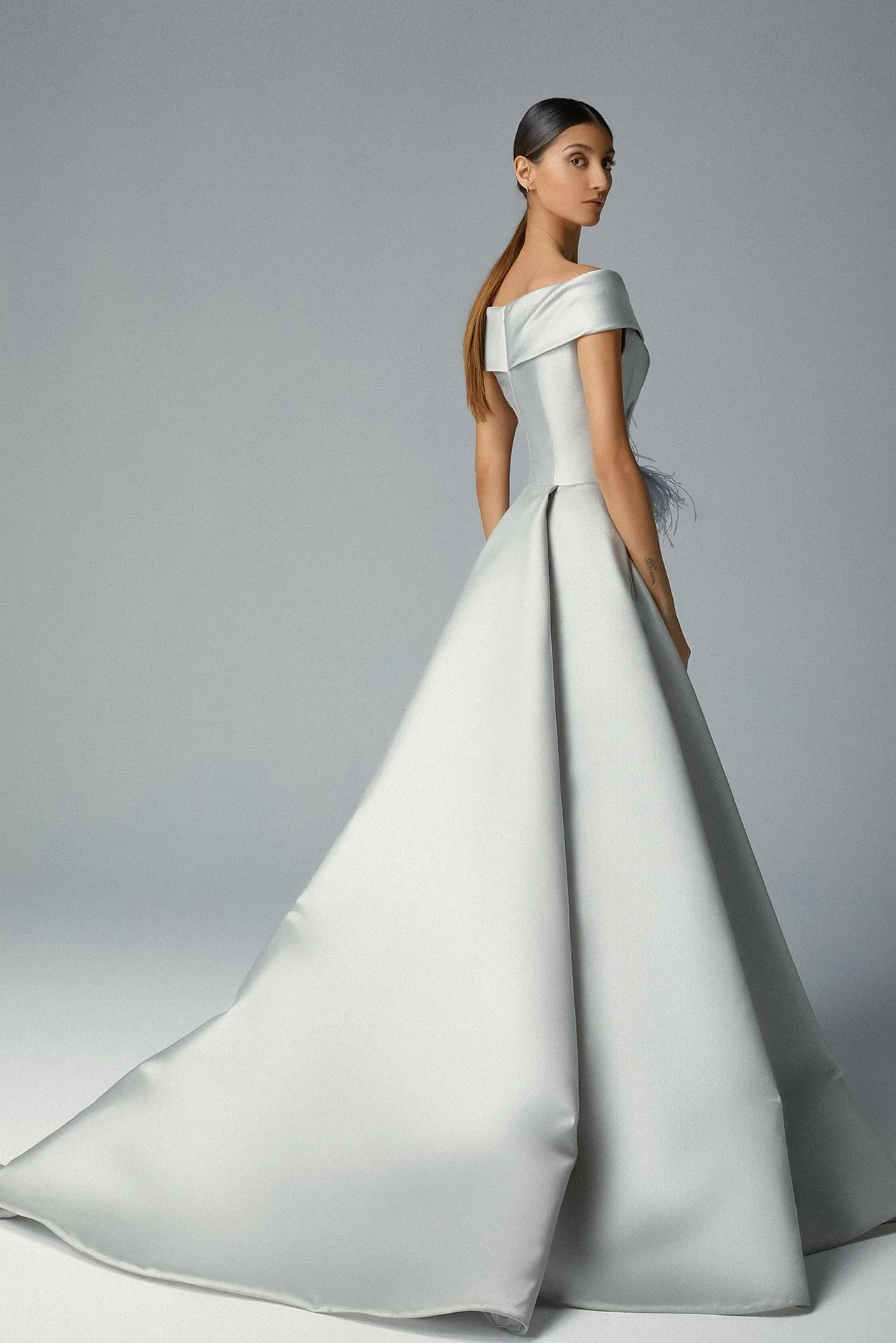 Off-shoulder Silver Cady Evening Dress Feathered with Swarovski Crystals on the Waist