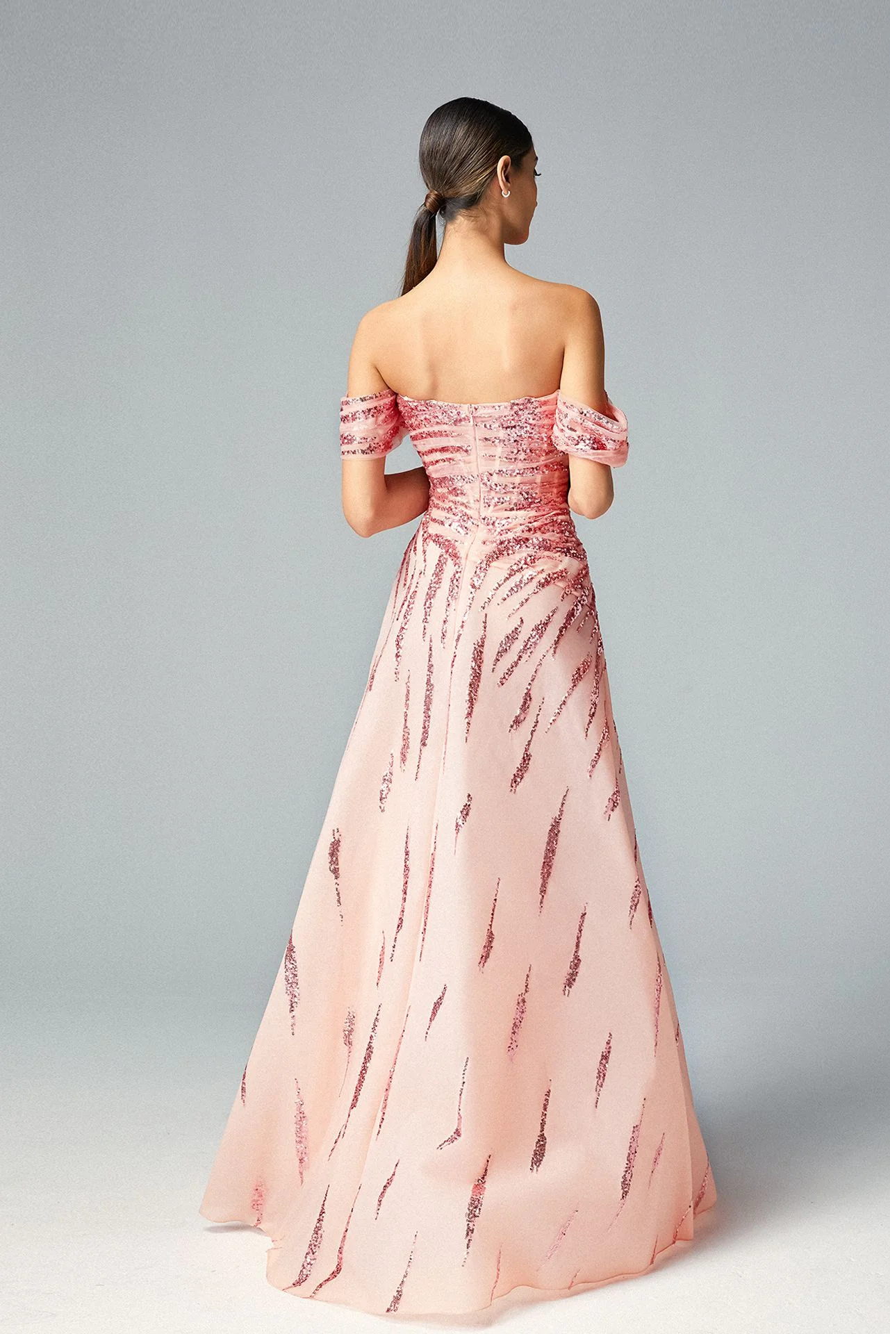 Fantabulous and heavenly off-shoulder sweetheart crepe pink ball gown made of tulle with foliage sequined pattern flowing dramatically to the floor with a side slit. A classiness to remember!