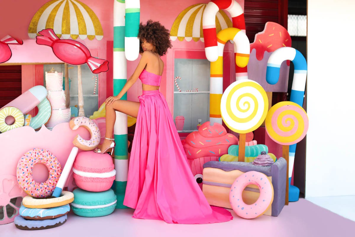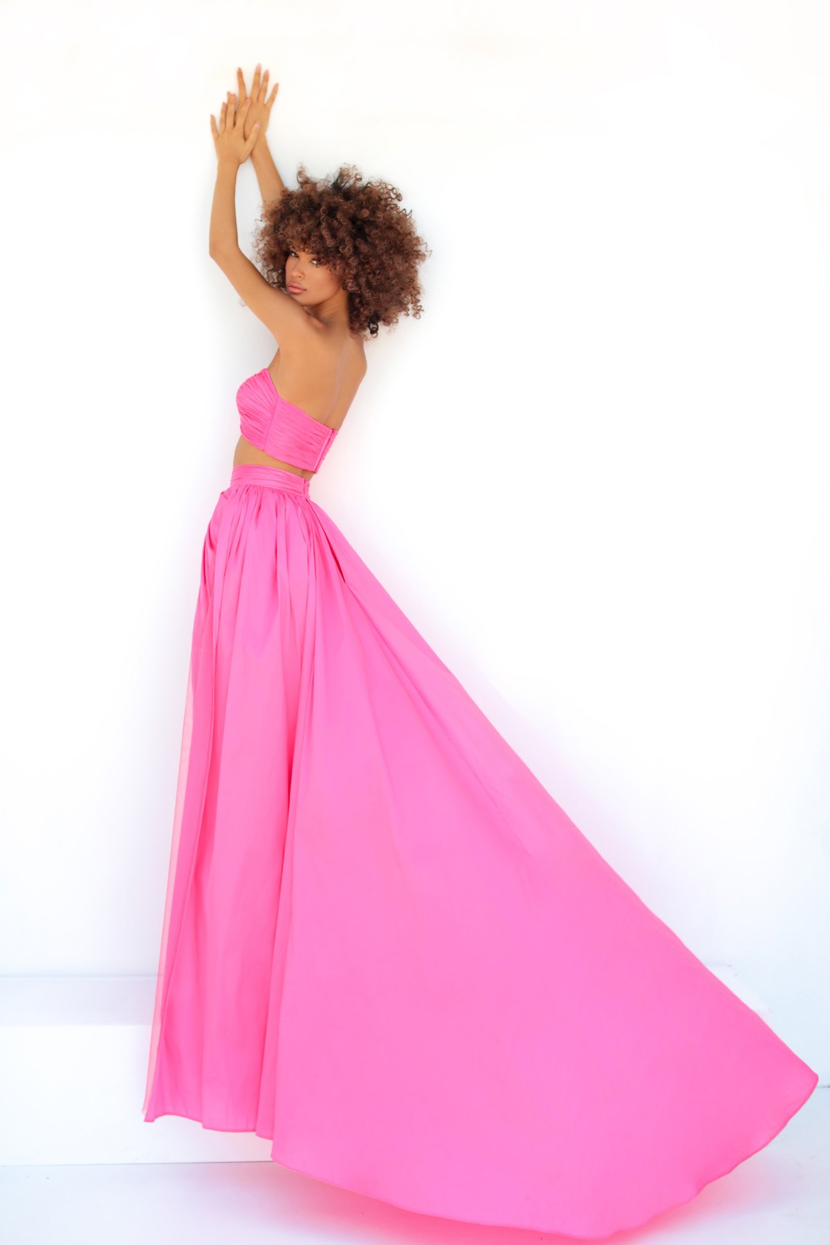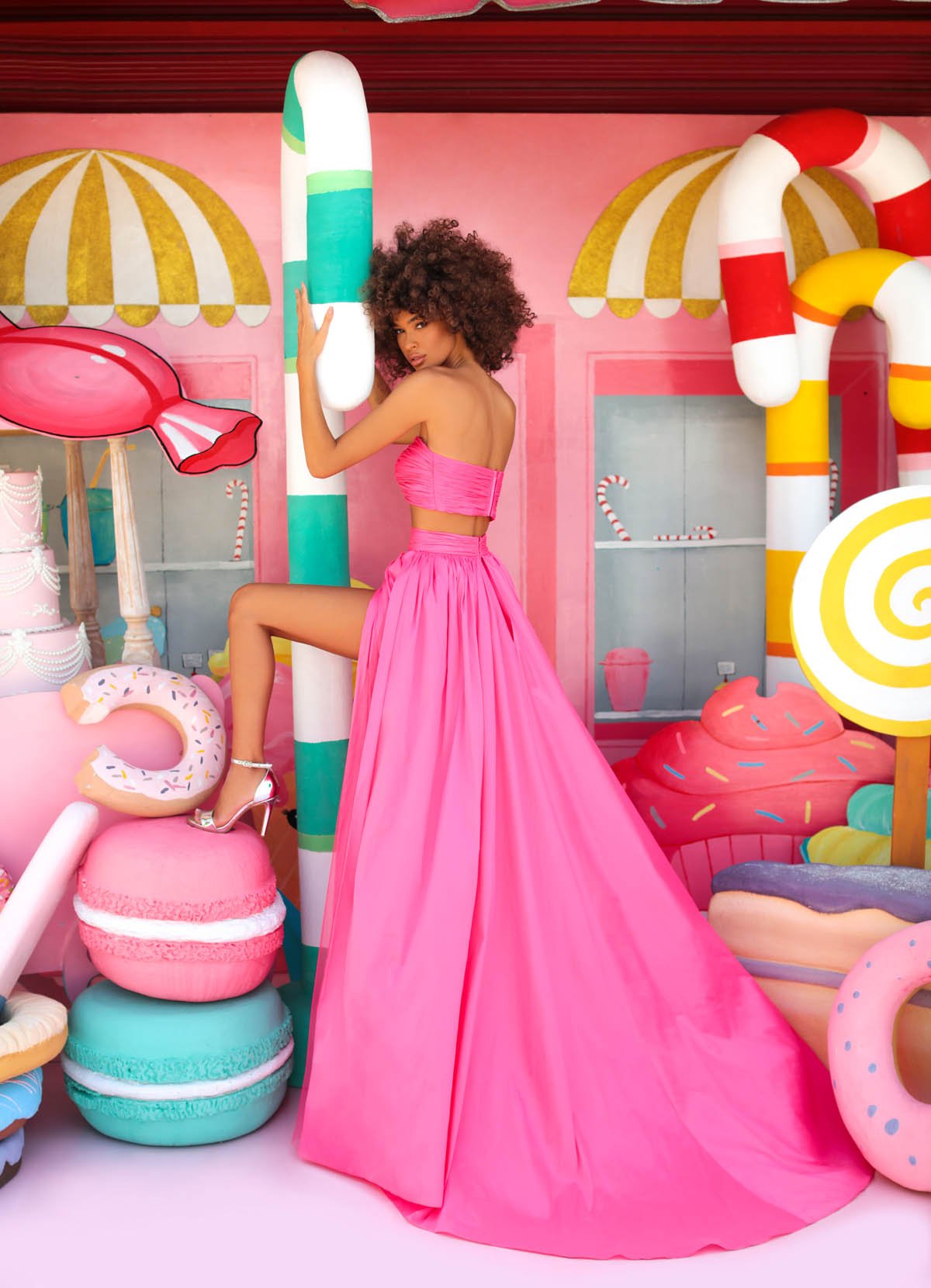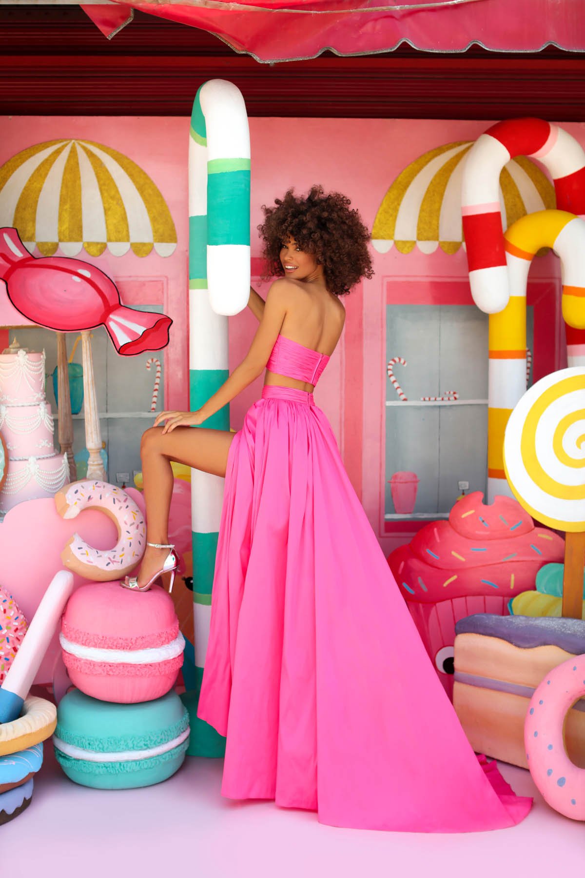 Simply stunning in vibrant hot pink, here is a two-piece gown that will take any man's heart in a New York minute. The bralette is cleverly twisted at the front, enhancing your feminine form; the skirt cinched at the waist flows into a full-length with a long split to reveal the sexiest of tiny shorts.