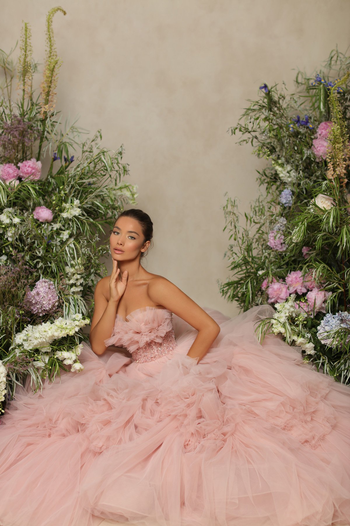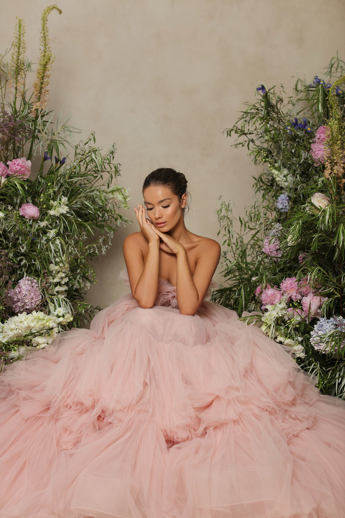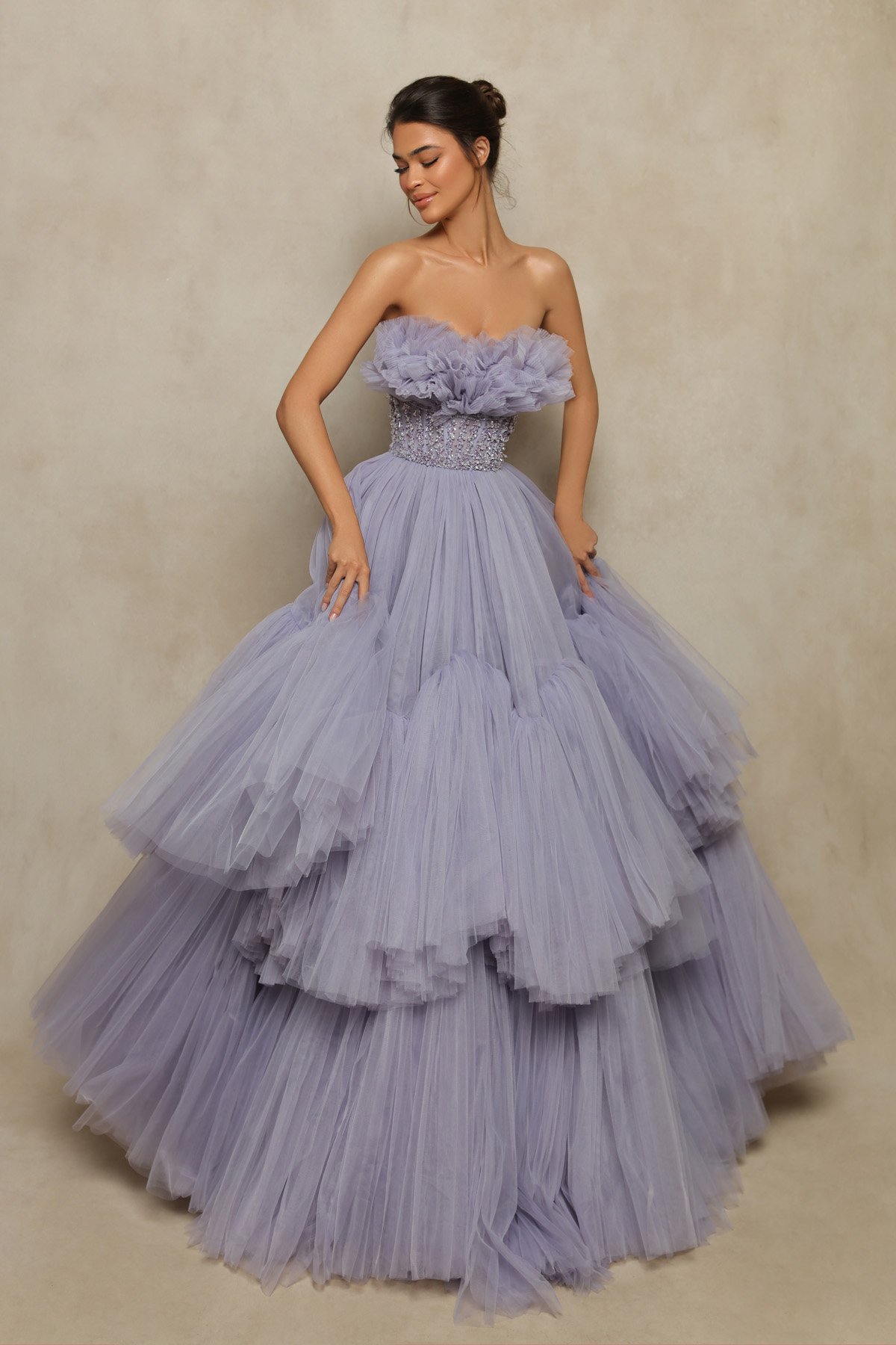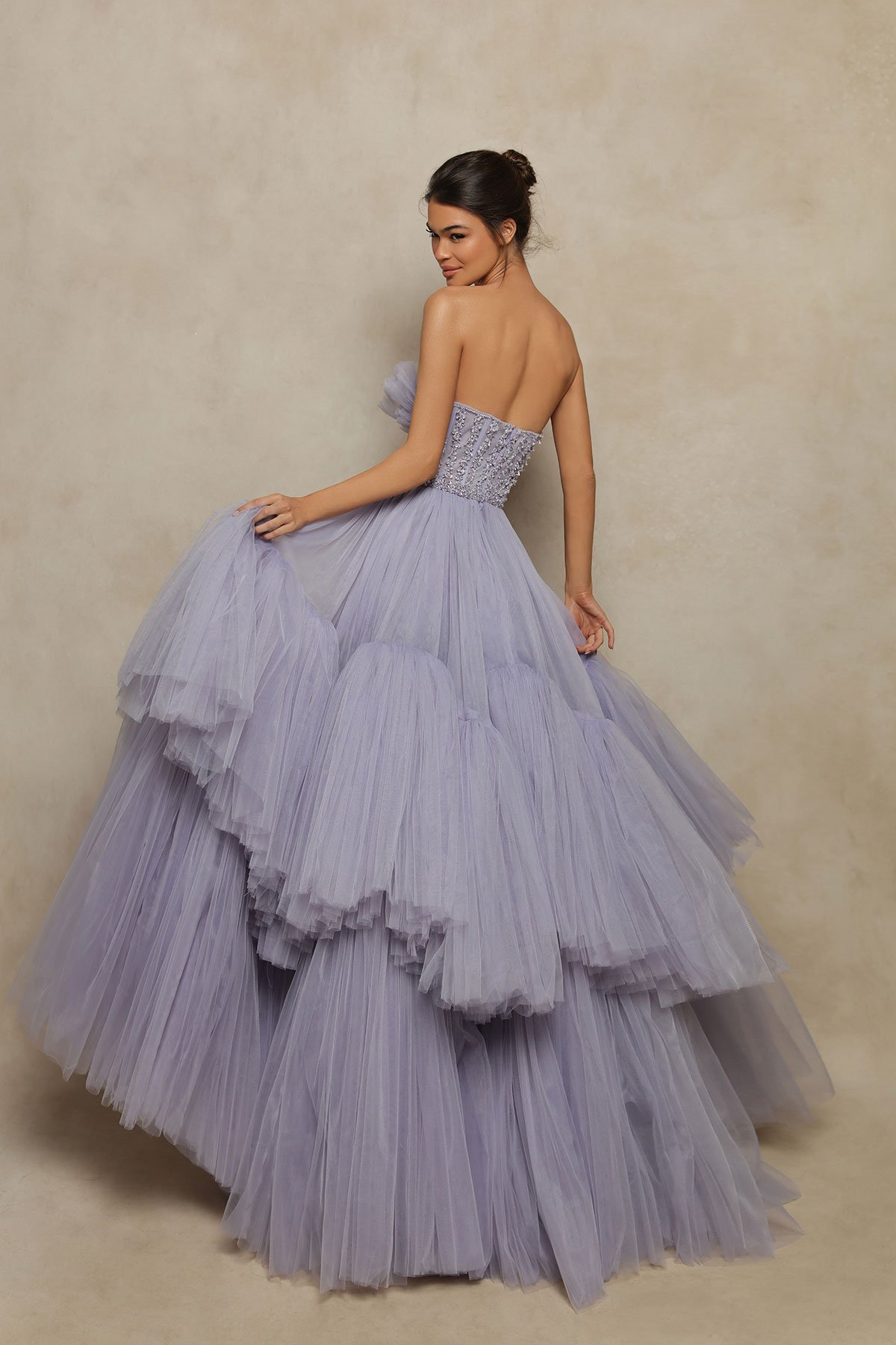 You will feel like a prima ballerina in this glorious gown, the skirt of which, crafted in deep double layers of frothy tulle. At the bodice, delicately appliqued sparkling sequins will define your waist, while an inverted tulip shape, also of delicate layers of tulle, will frame your feminine decollete.