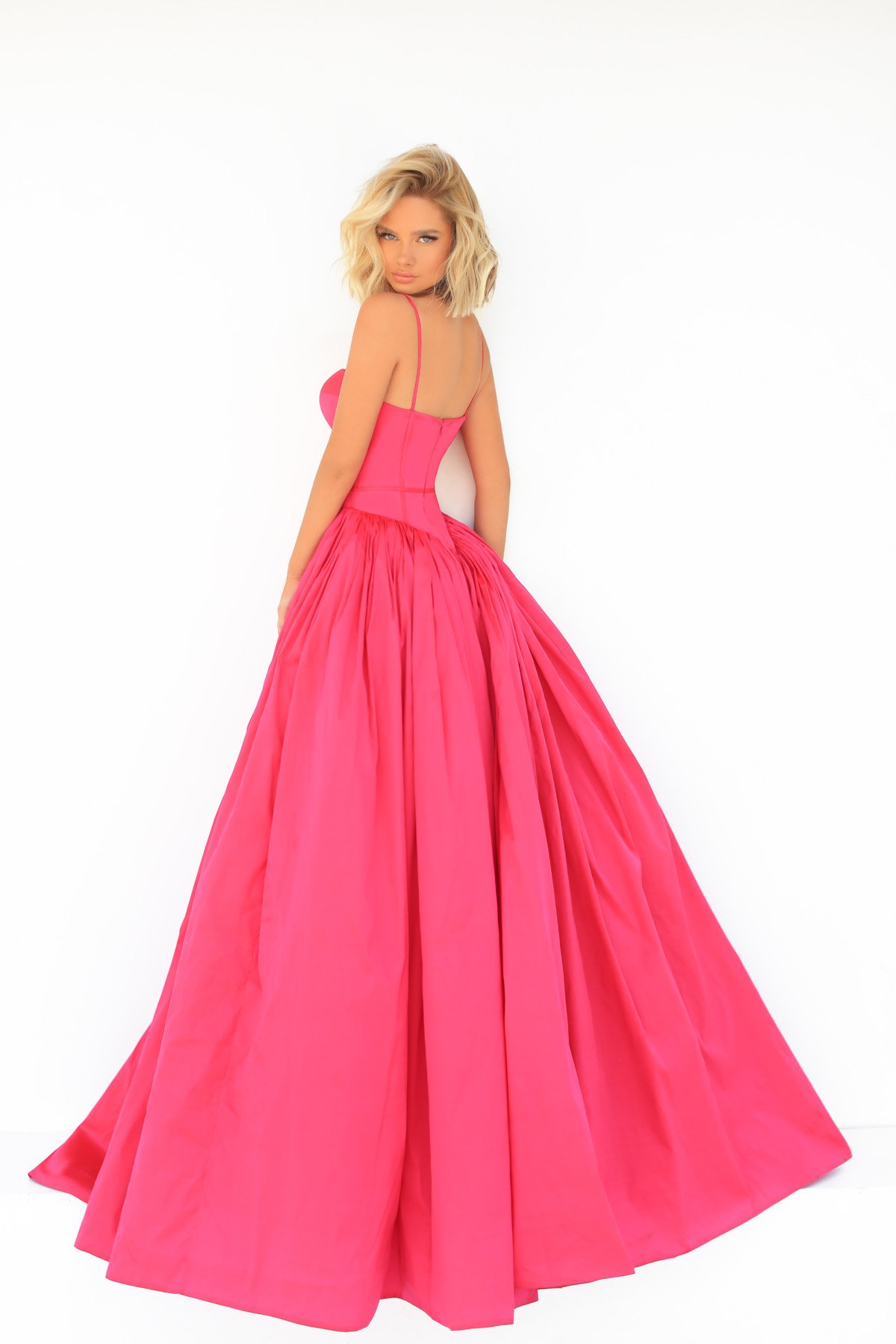 Glow in the colour of the season – hot fuchsia pink. A sculpted bodice ending in a V front and back enhances the glamorous full skirt of this red - carpet ready gown.