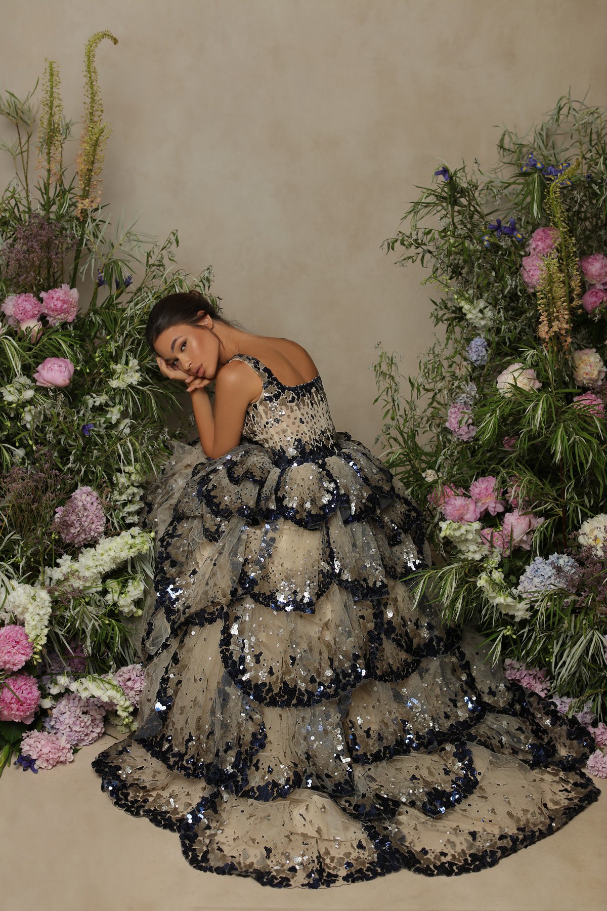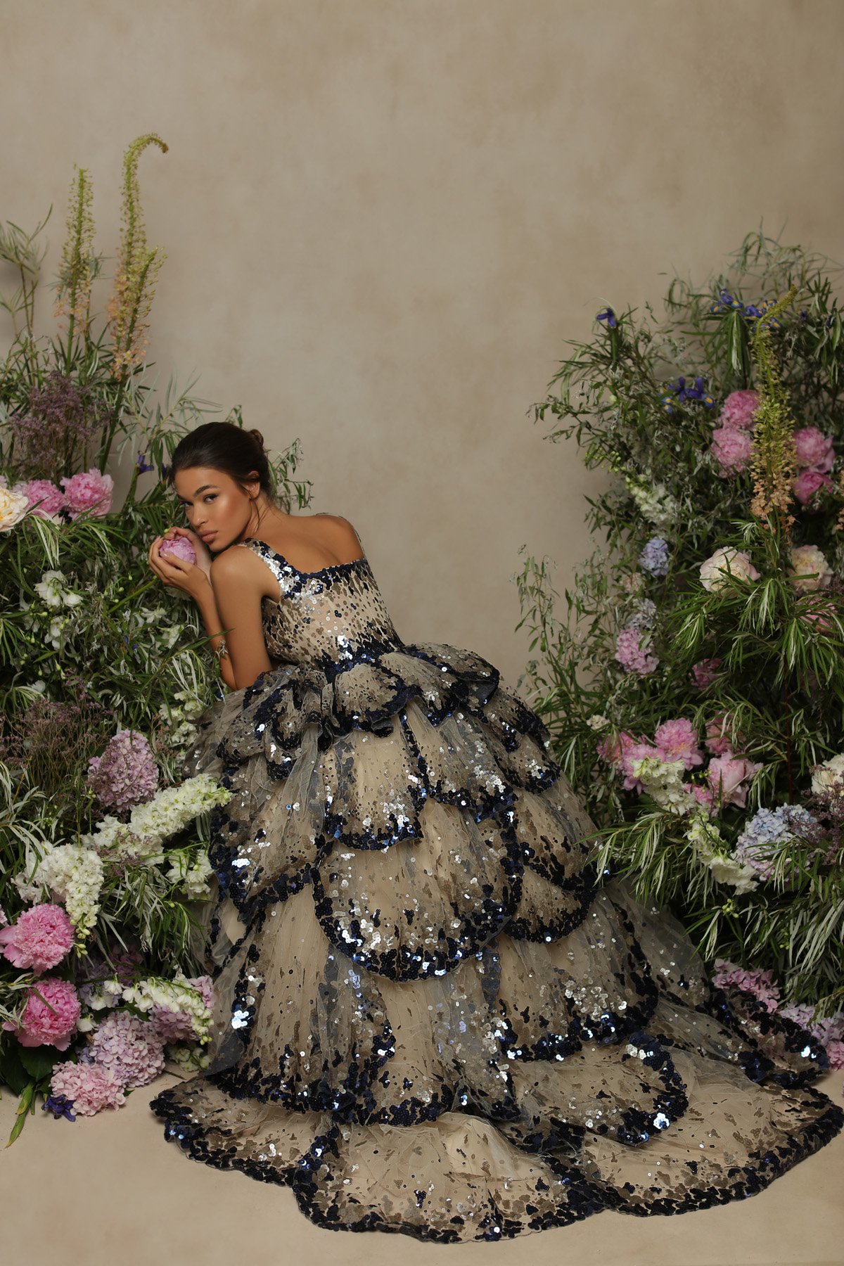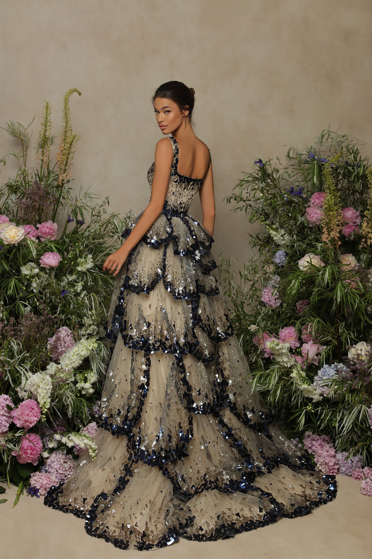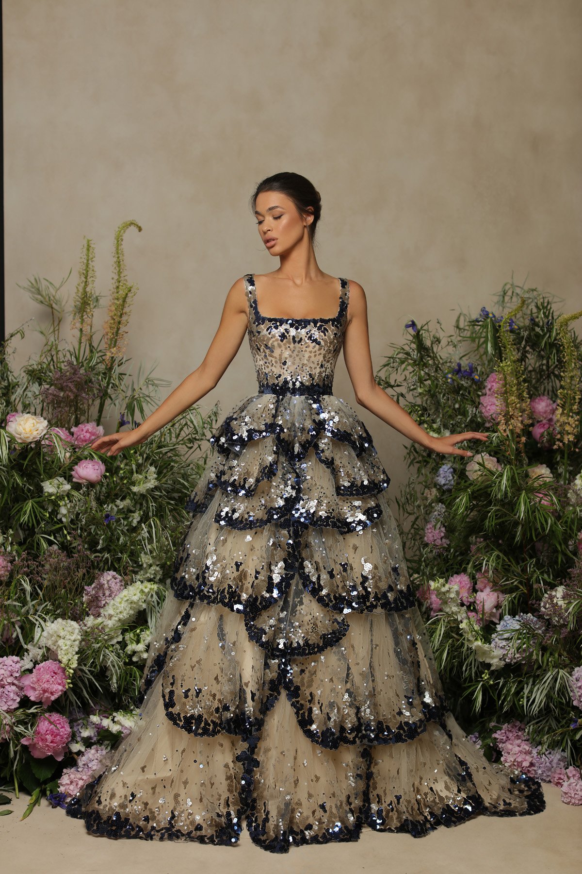 This stunning dress features a fitted bodice with a square neckline and delicate straps. The voluminous skirt cascades in multiple tiers, adorned with shimmering sequins and intricate detailing, creating a breathtaking look perfect for a glamorous evening.