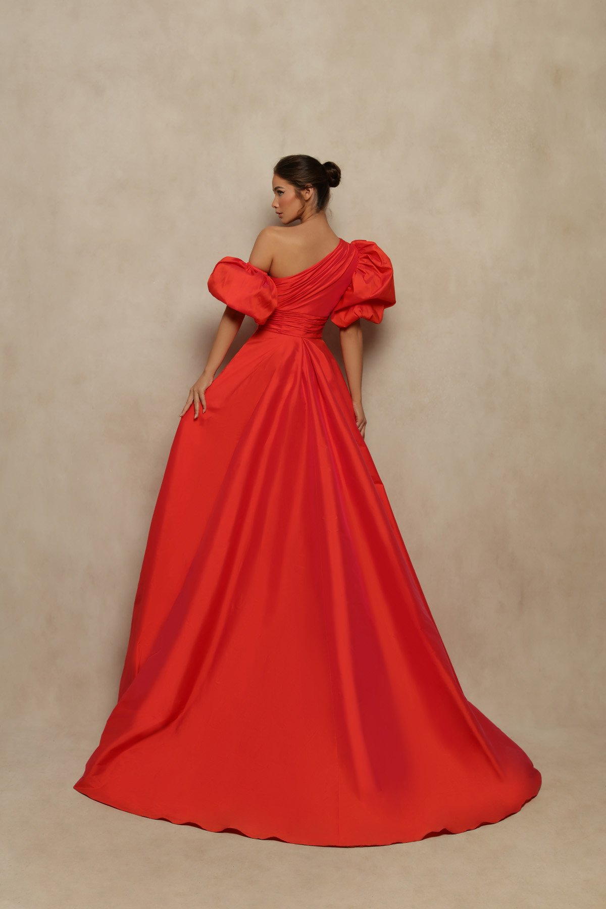 With its exquisite design and stunning, glorious colour of blazing red, here is a head-turning gown that will be the envy of all. Uniquely crafted in taffeta, the bodice is asymmetrically drawn into dramatic puffed off-shoulder sleeves, and at the skirt, the dramatic full volume ends in a stunning regal sweep.
