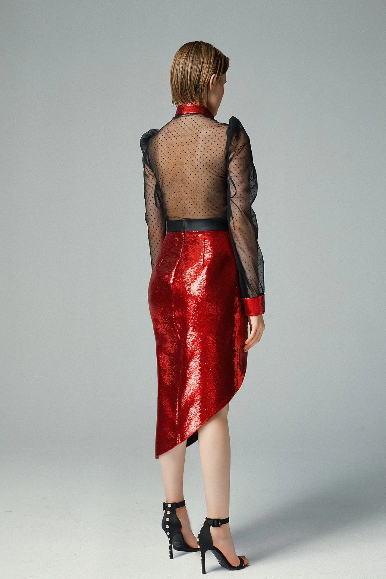 Far-fetched sheer black dotted tulle top with a sheer back and slightly puffed long sleeves on the shoulder adorned on the bust with embroidered floral sequined motifs. This slender black top is intertwined with a ruby sequined band from the neck to the waist and a line of vertical black buttons on the neckline, matched with similar ruby sequined bands on the Wrist. Paired with a ruby sequined draped skirt that open with a thigh-high slit and is defined with a black Cady belt on the waist. This mingling of black top and ruby midi skirt is conjoint in a dress look like, a set of unique sensuous high-class coherence!