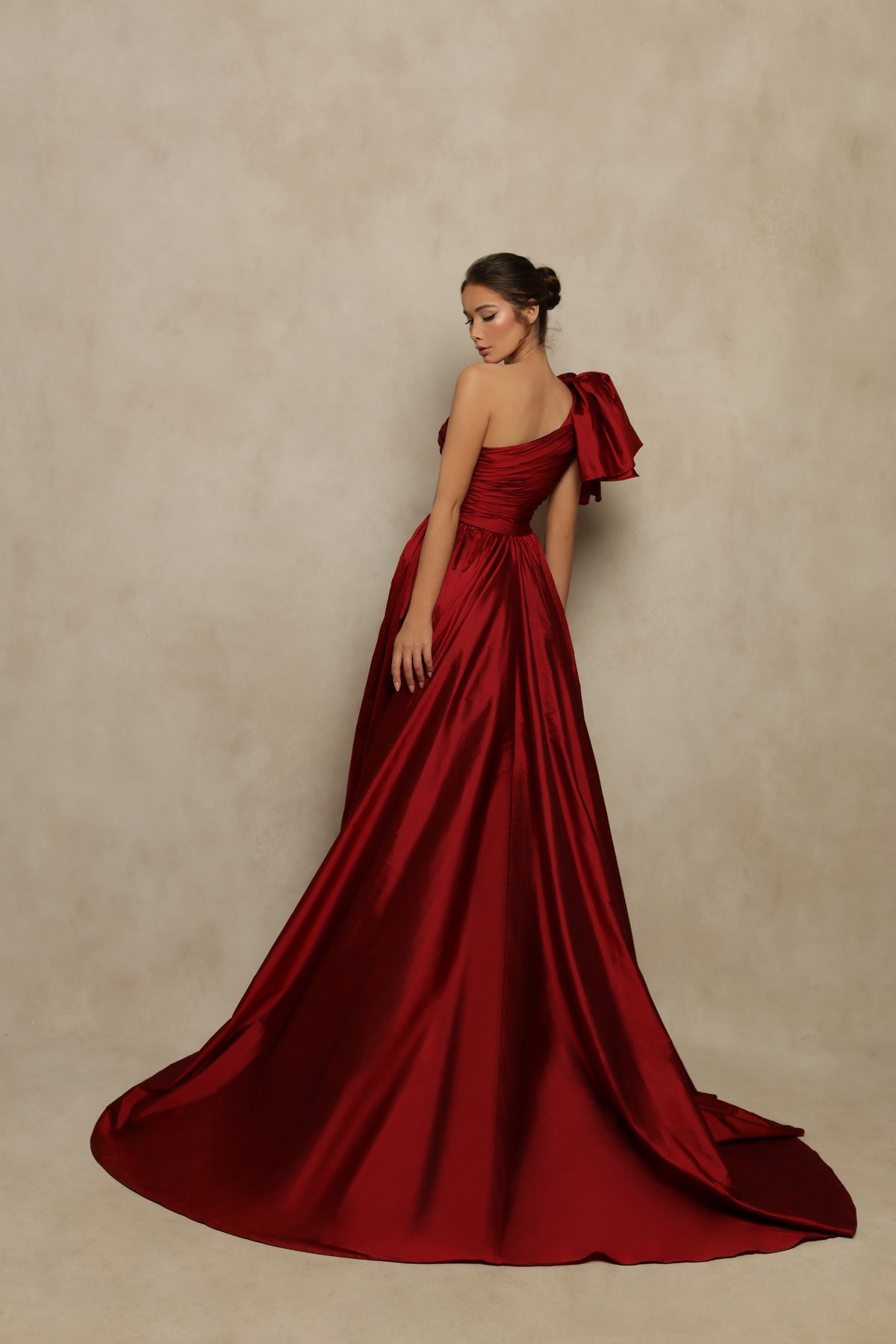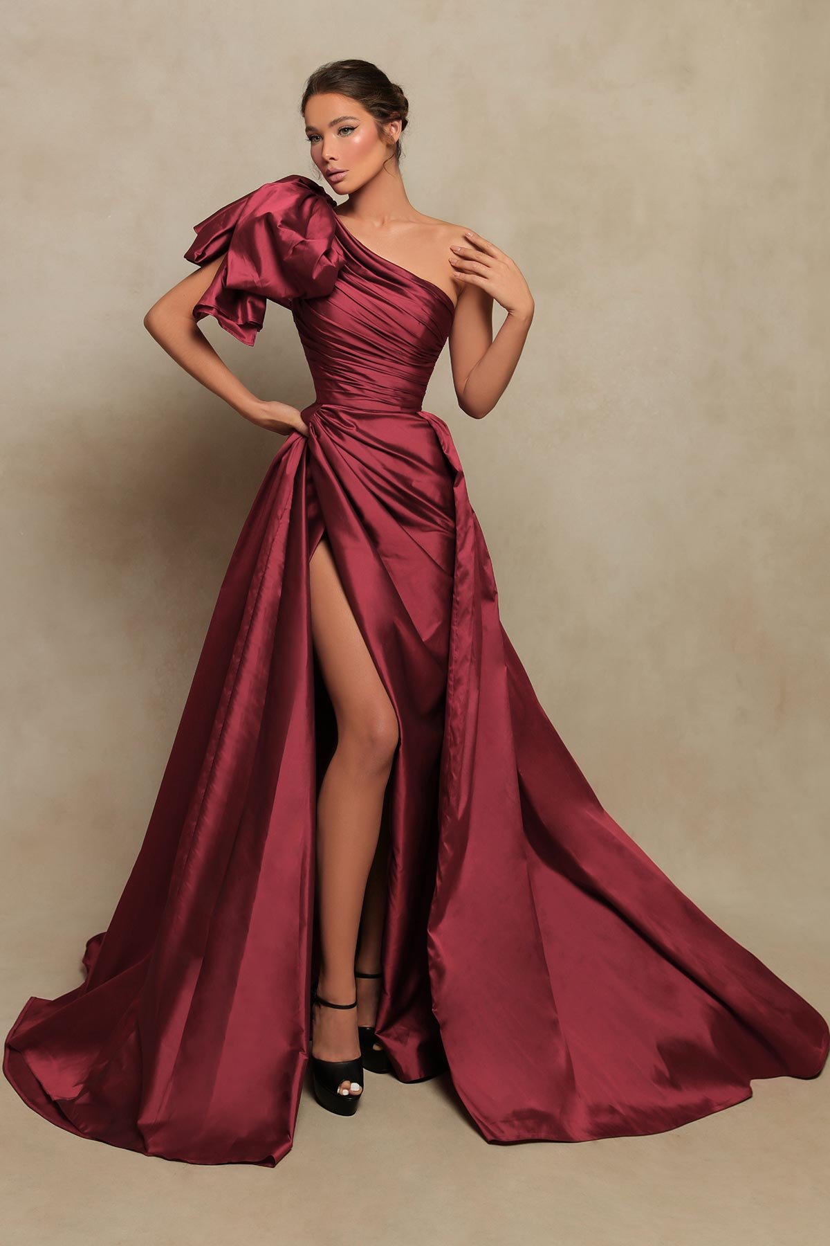 Exude high fashion extravaganza in this one-shoulder evening gown, featuring a dramatic ruffled satin accent. The bodice is gathered in pleats, twisting around the waist to connect to a lavish A-line skirt with a high front slit.